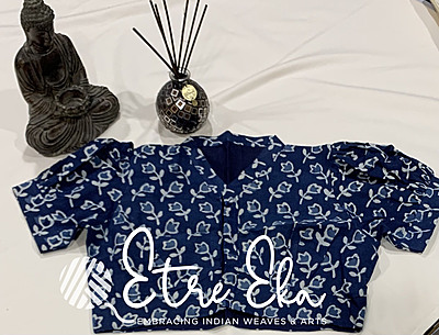 Saree Blouse Blue Indigo Print Cotton with puff sleeves-