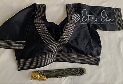 Embroidered Black Pure Silk blouse with Gold and Silver Zari handwork on neck and sleeves-Medium