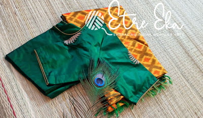 Pure Handwoven SICO IKKAT Pochampally Saree in Green-Yellow-Orange-8 and 8 inch Jari Borders with unstitched Blouse