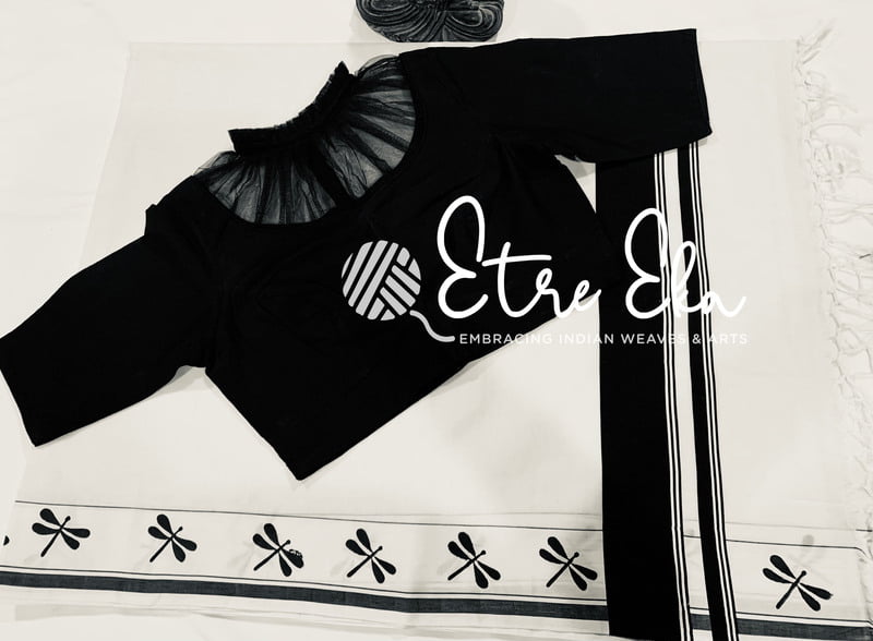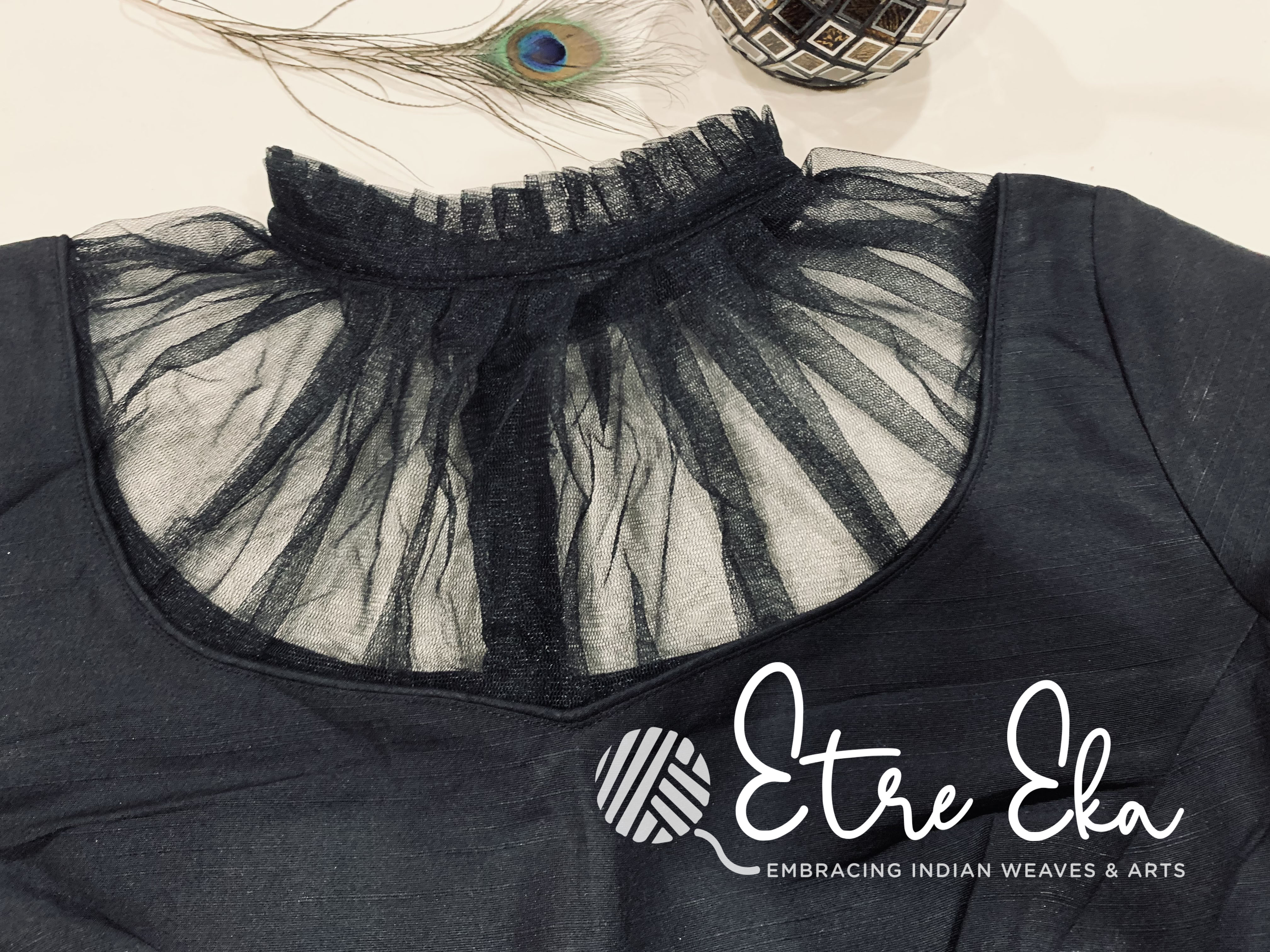 Saree Blouse.Beautiful Designer Slub Cotton Blouse-Black. High Neck with Net frills. Back Open