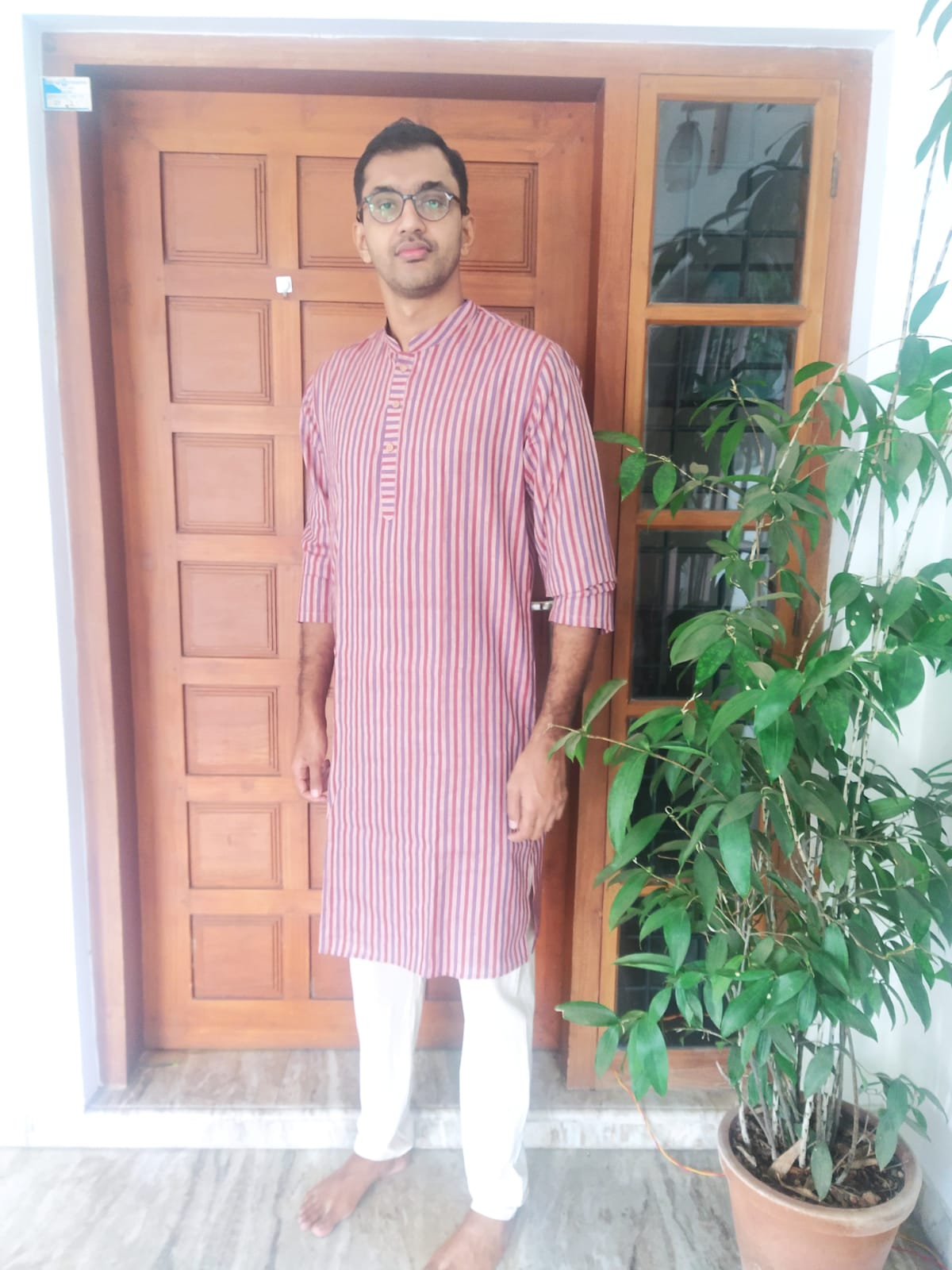 Men's Kurta -Light Brown Blue and Maroon Stripes Khadi Kurta