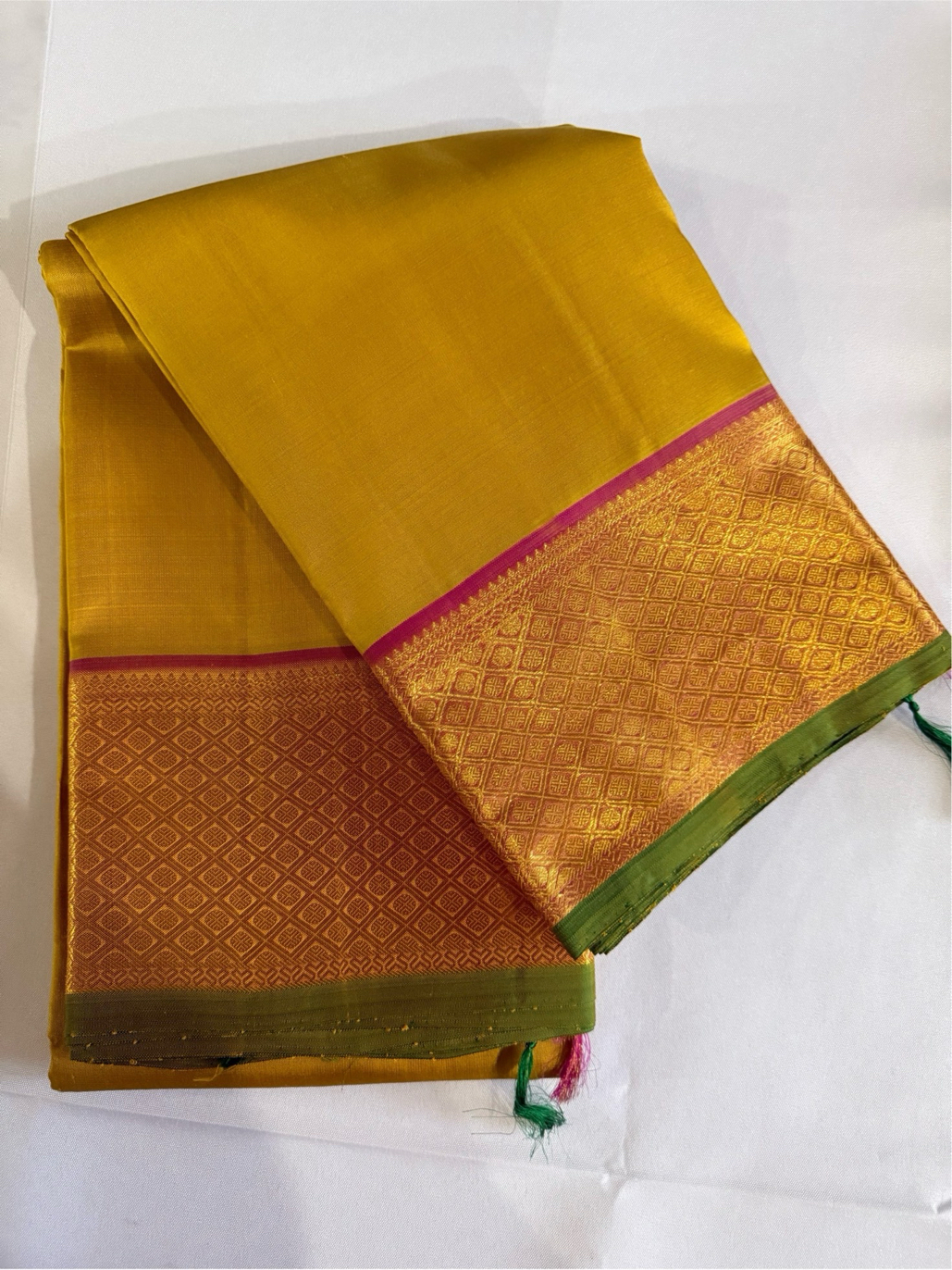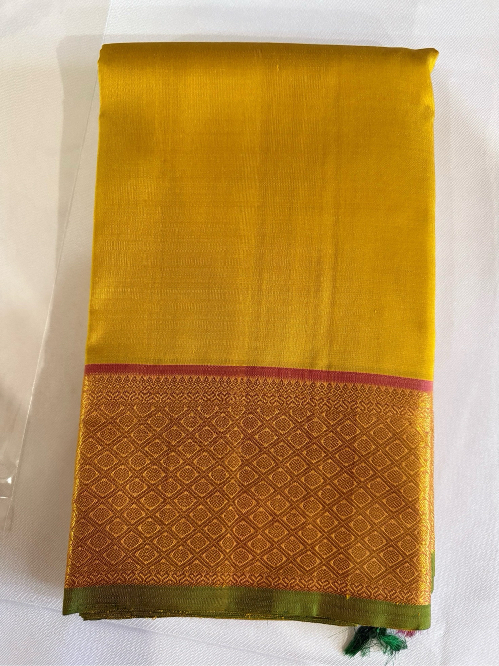 MUSTARTD KANCHIVARAM PURE SILK SAREE WITH GOLD ZARI BORDER- UNSTITCHED BLOUSE