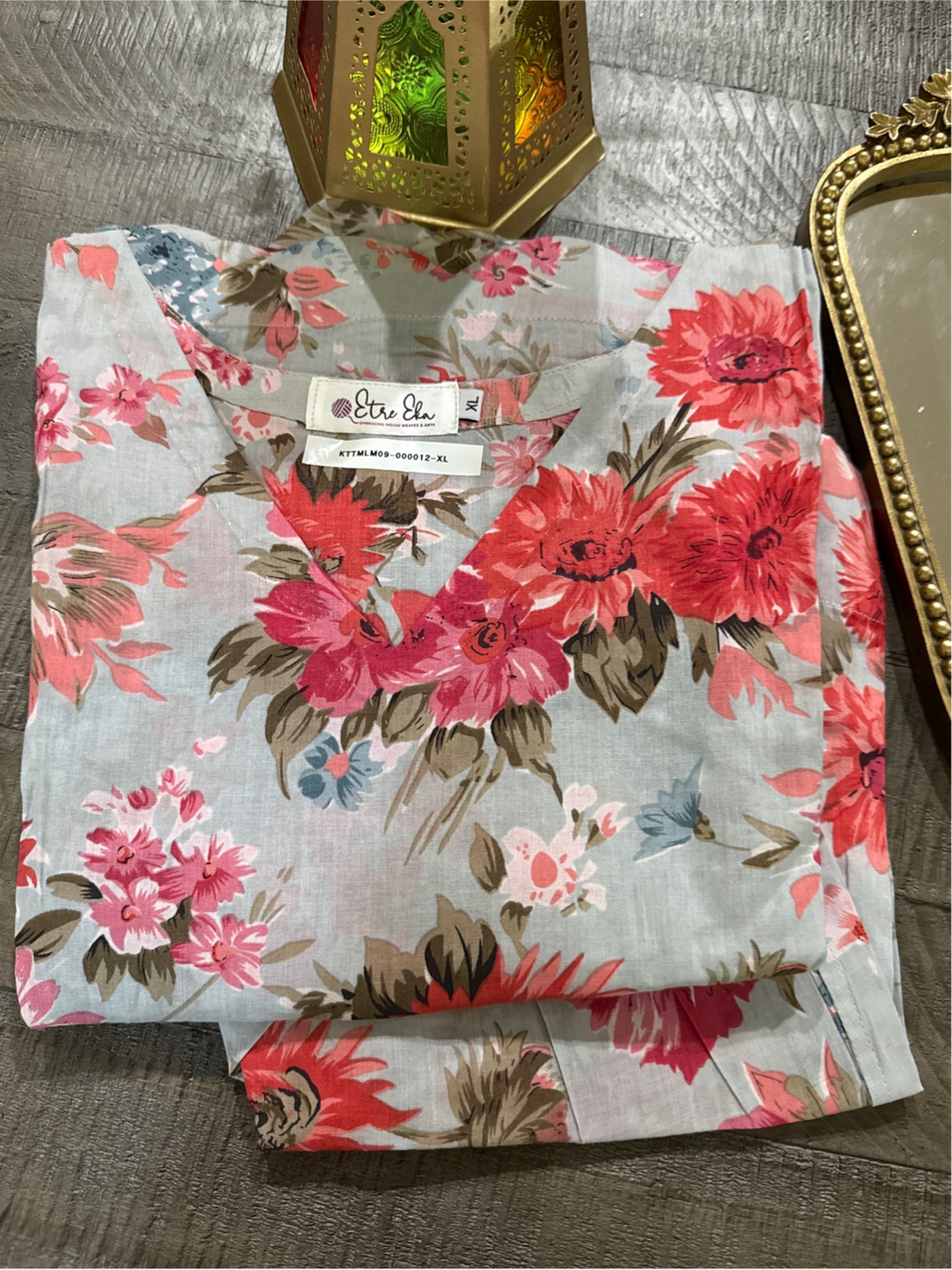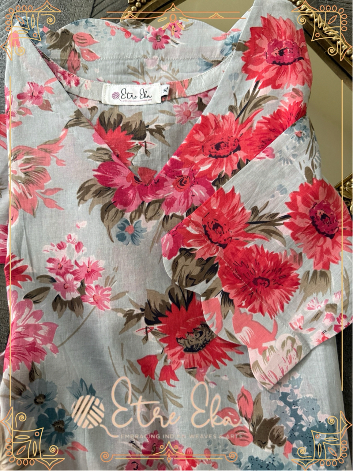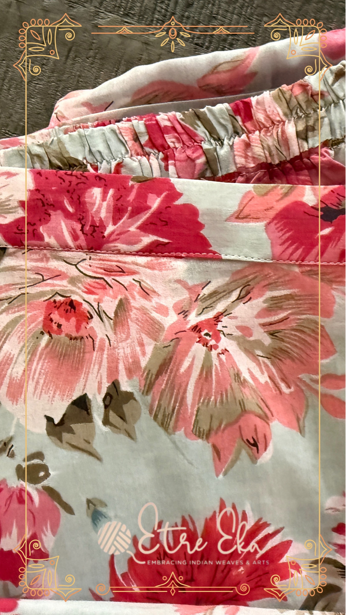 Muslin Kurti Set in Floral Print Pastel Blue and Pink- Unique Casual Wear