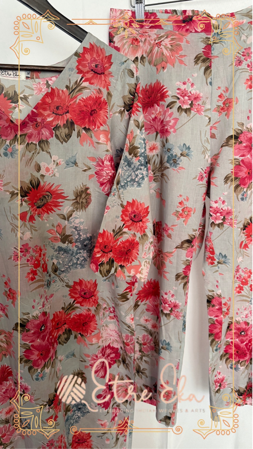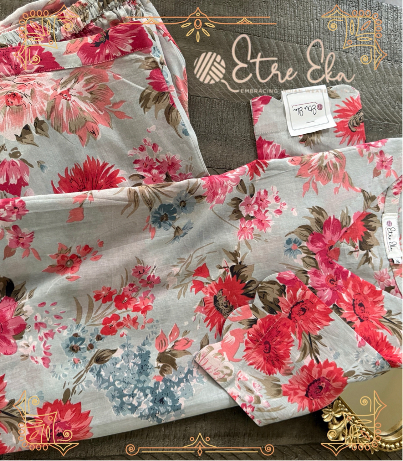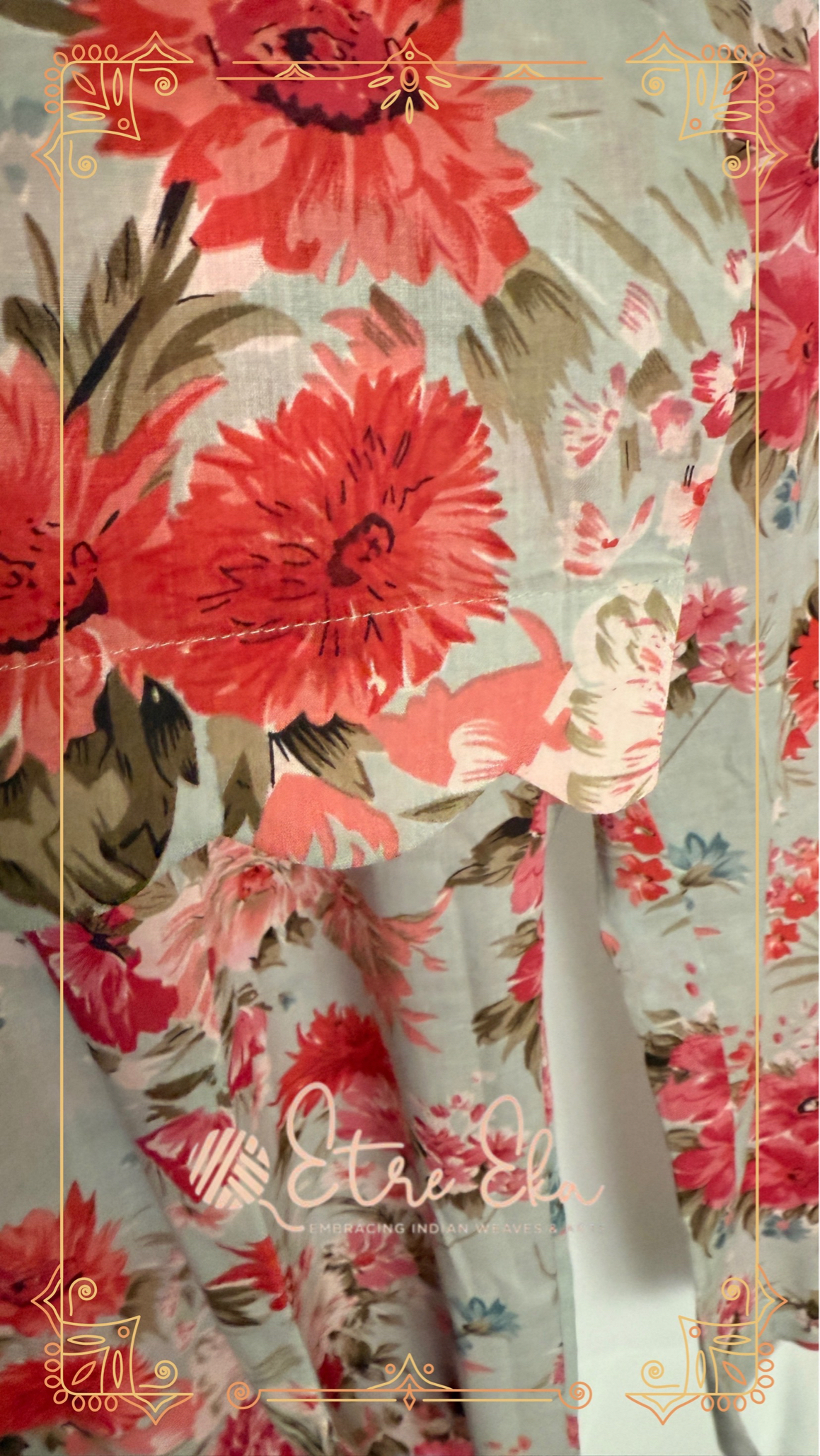 Muslin Kurti Set in Floral Print Pastel Blue and Pink- Unique Casual Wear