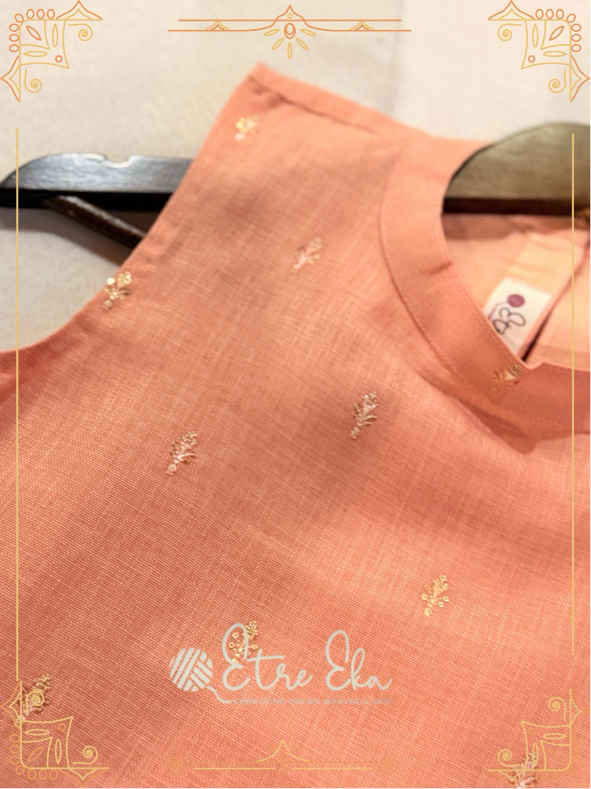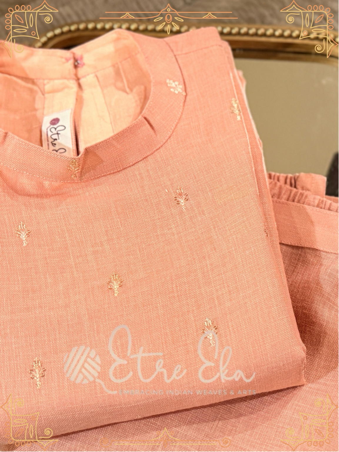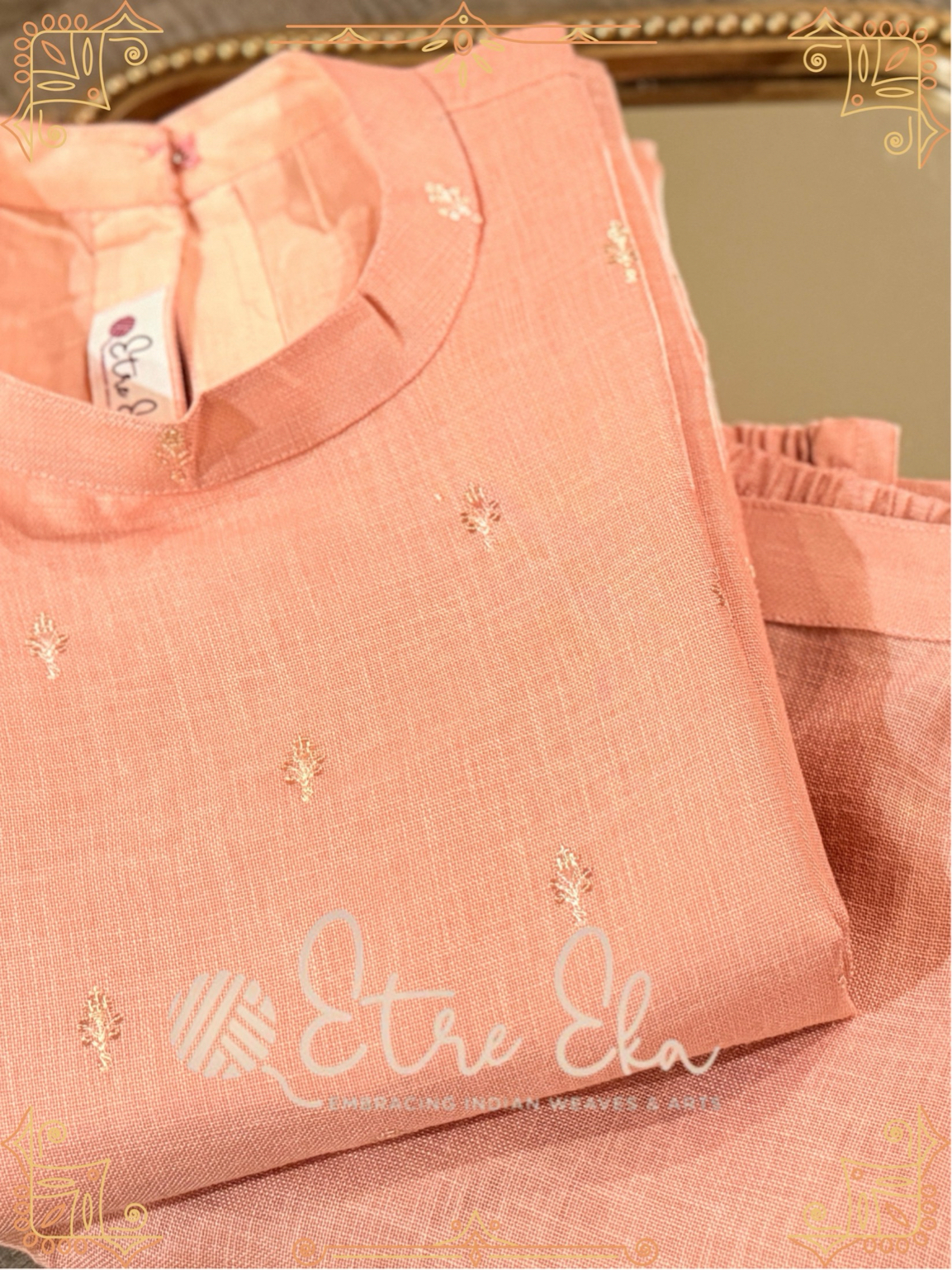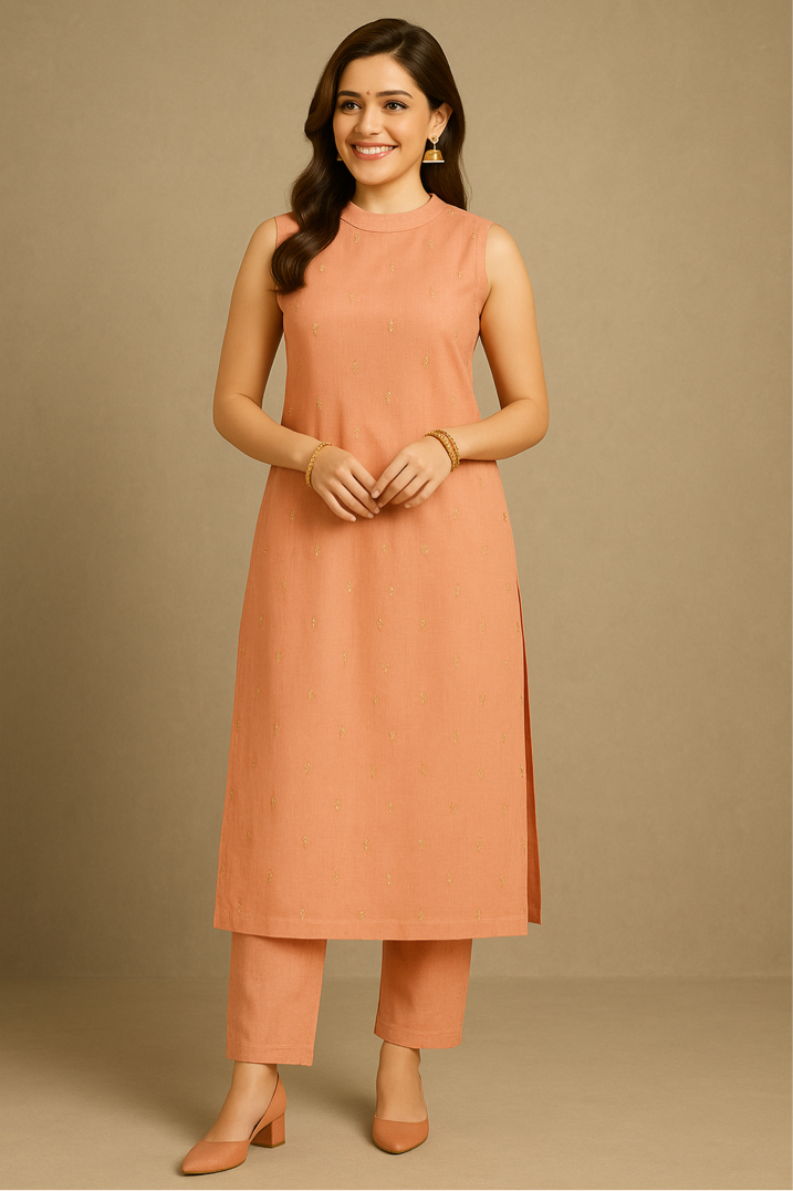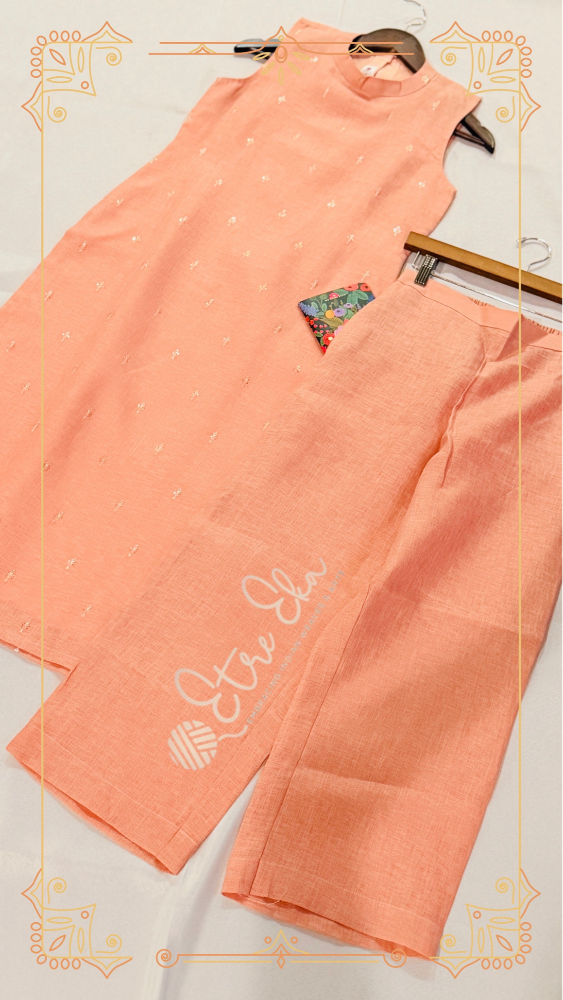 Elegant Linen Kurti Set in Pastel Peach - Sleeveless top with Loose fit pants -S