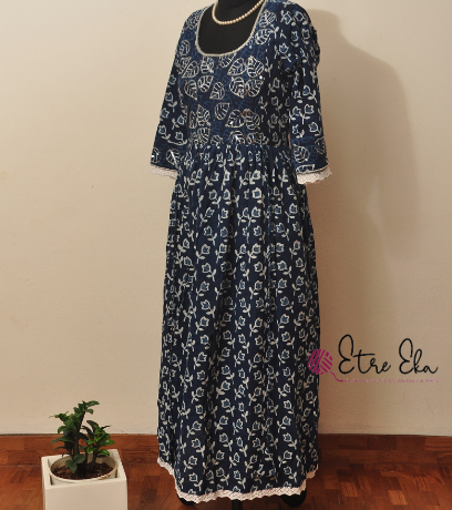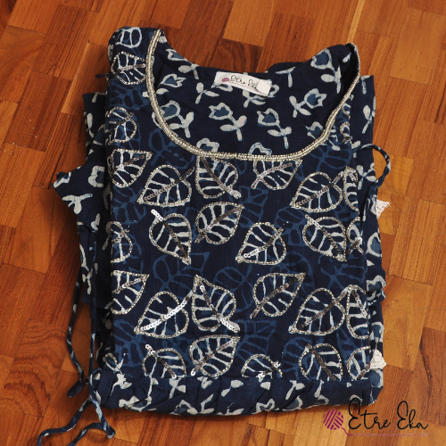 Indigo Hand Block Printed Kurti- Flower and Leaf Print with Beautiful Hand Embellishments