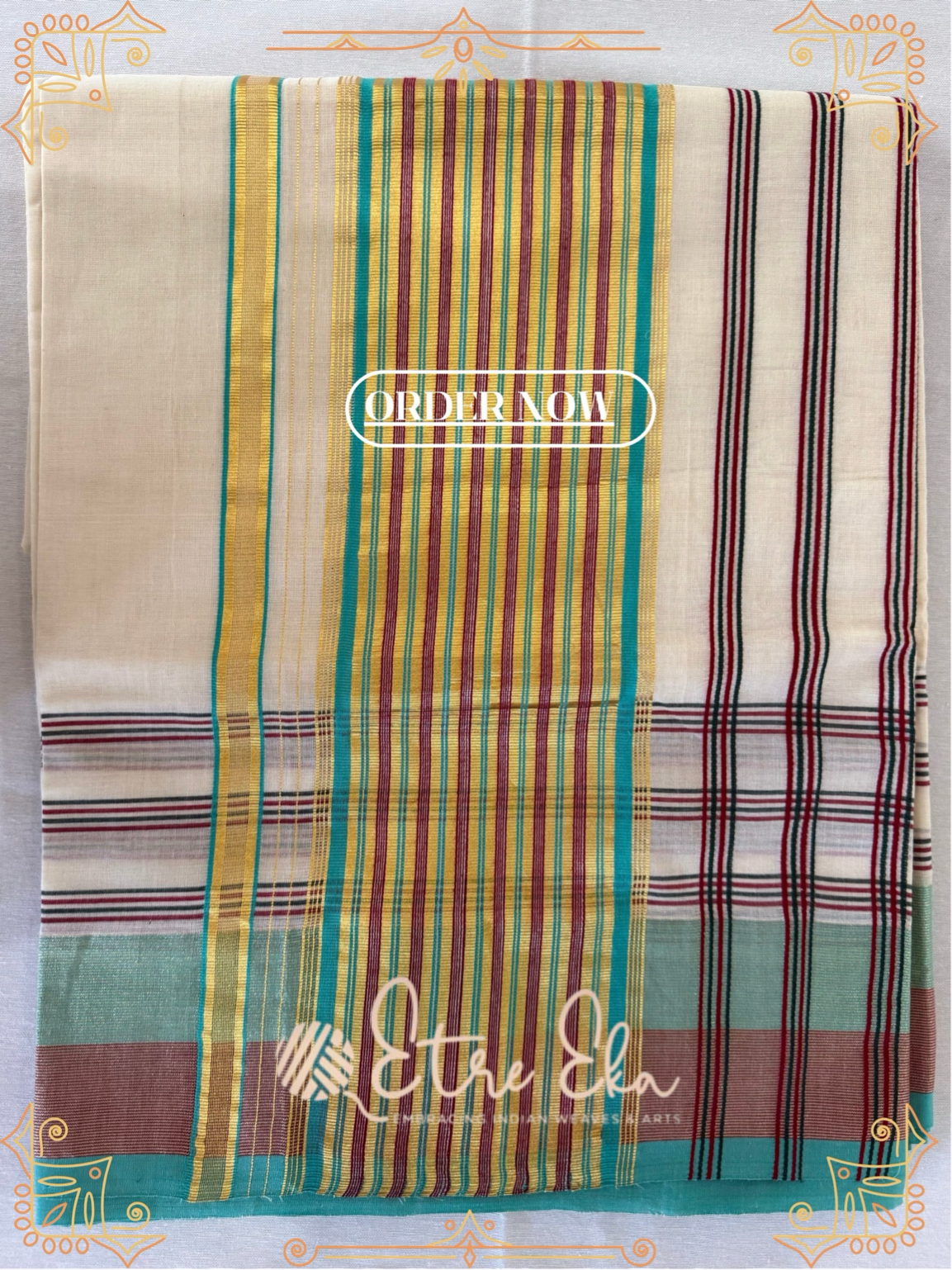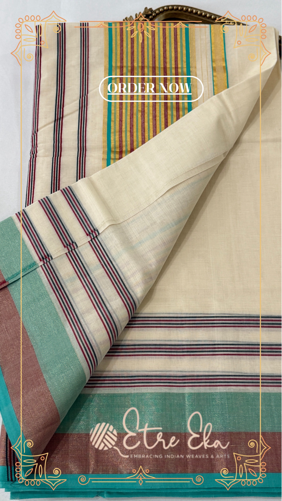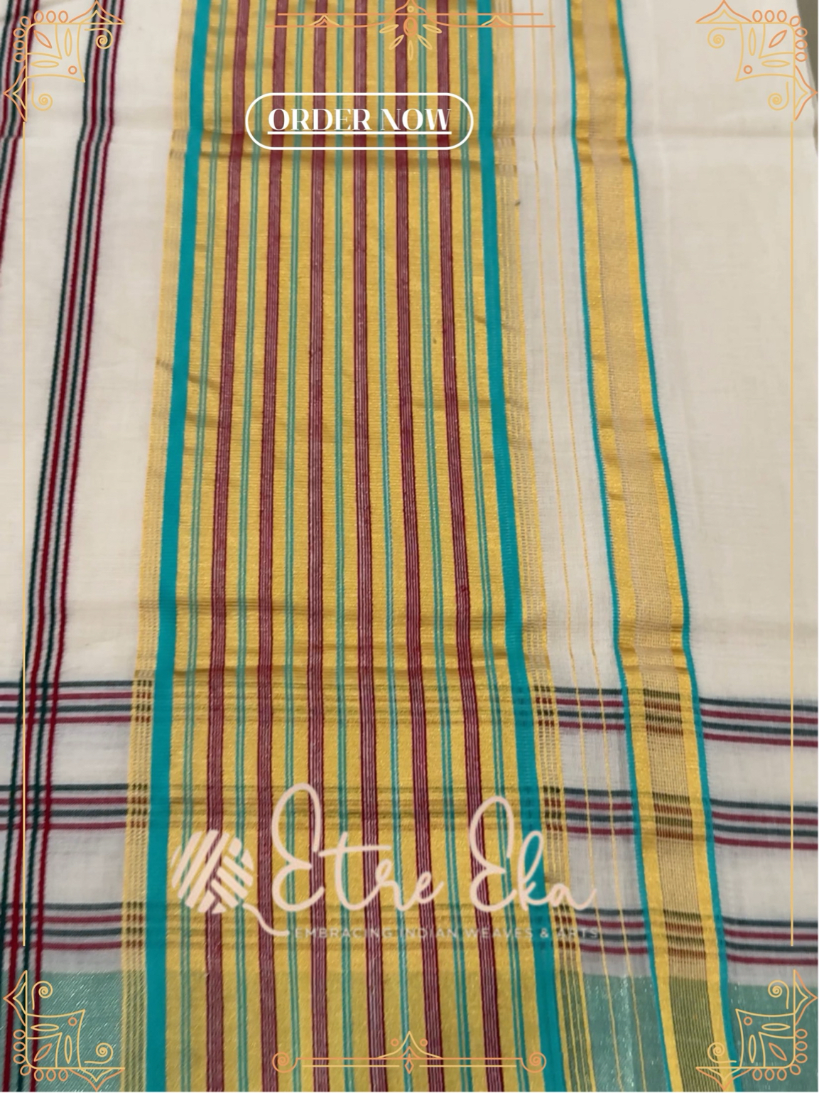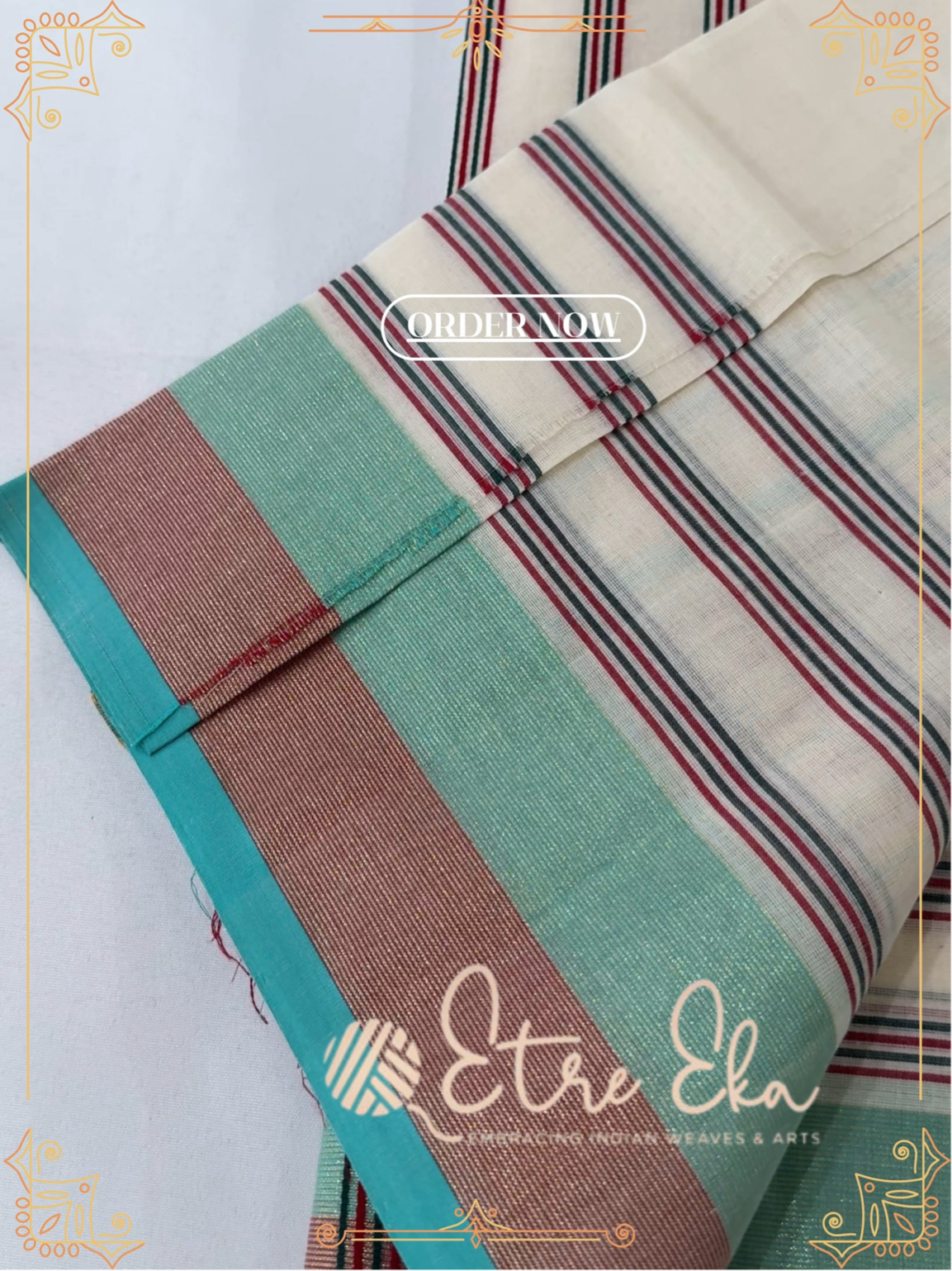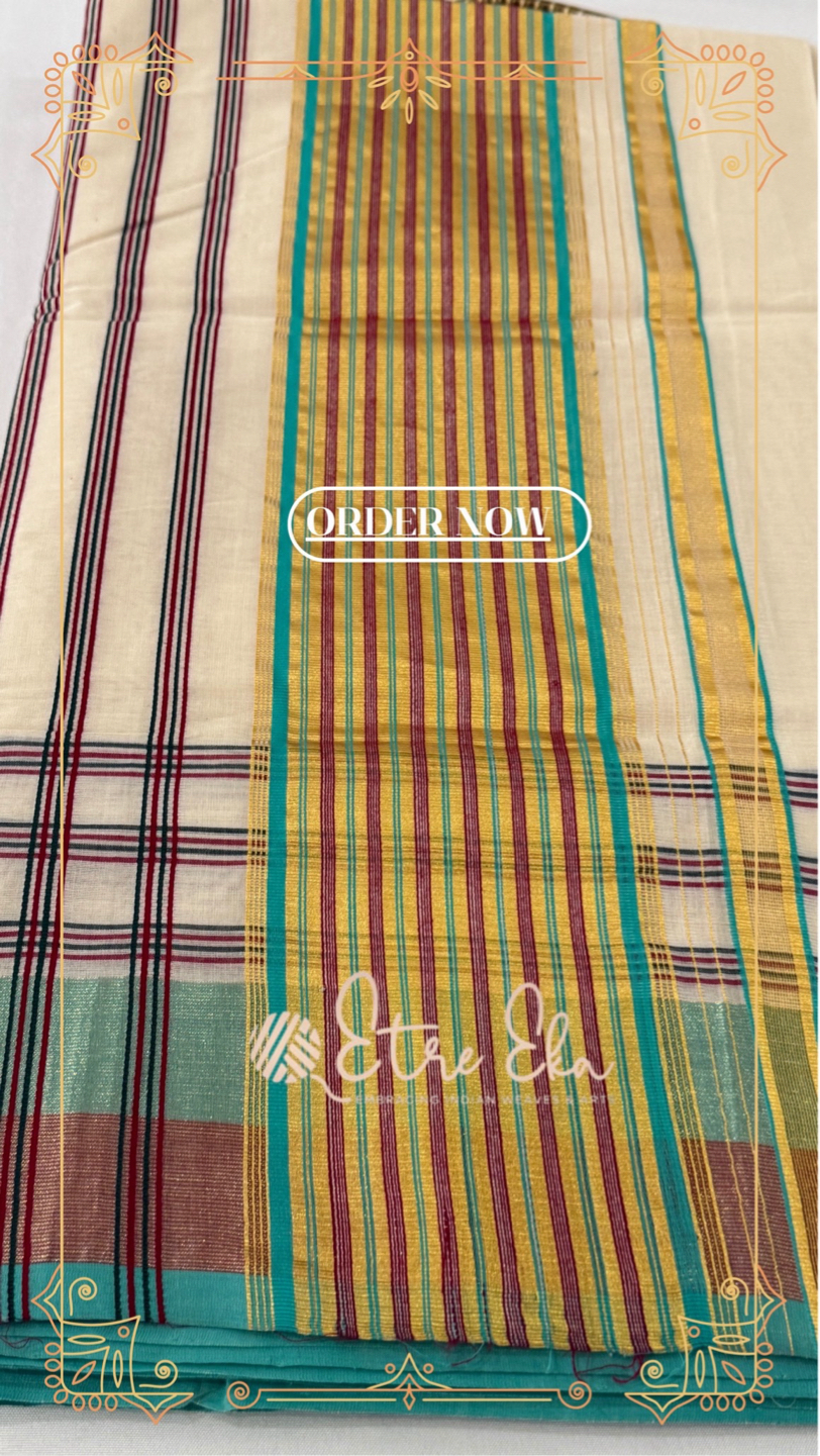 Kerala Saree from Balaramapuram With AquaGreen, Maroon and Gold Lines