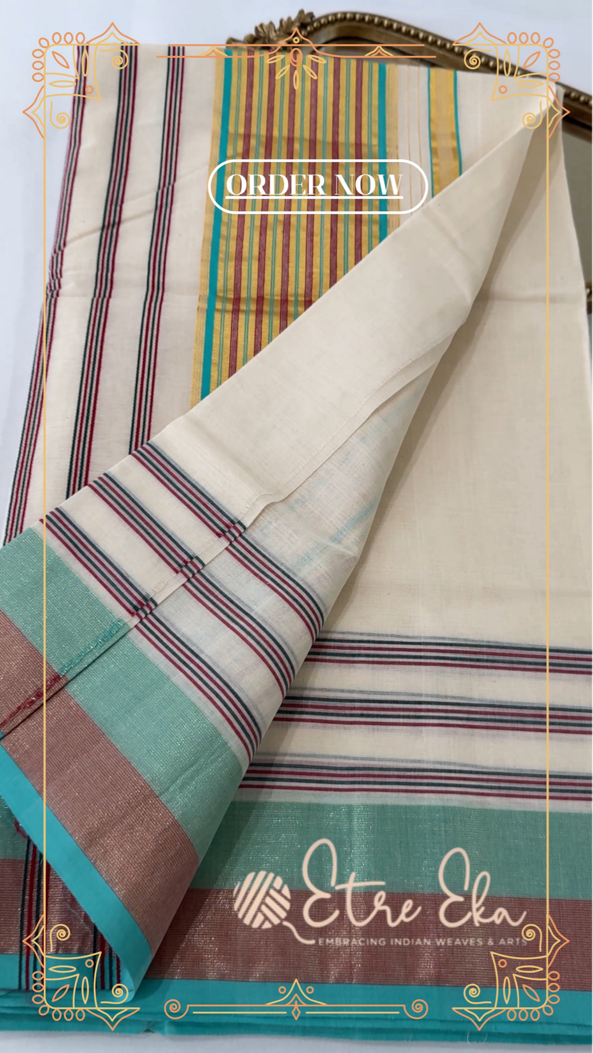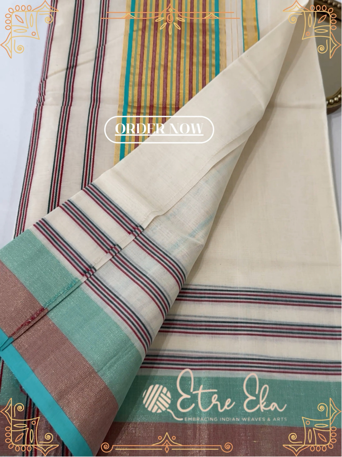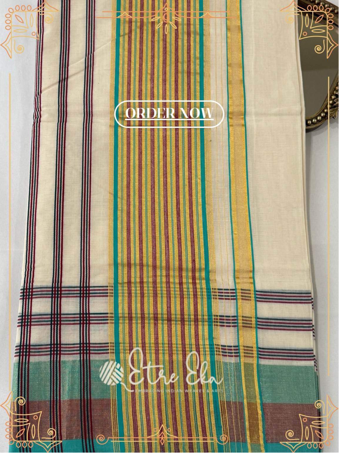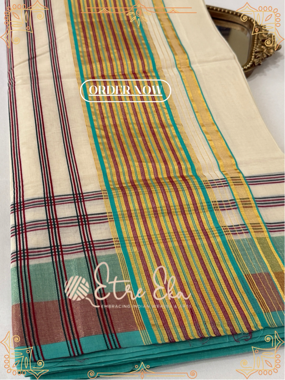 Kerala Saree from Balaramapuram With AquaGreen, Maroon and Gold Lines