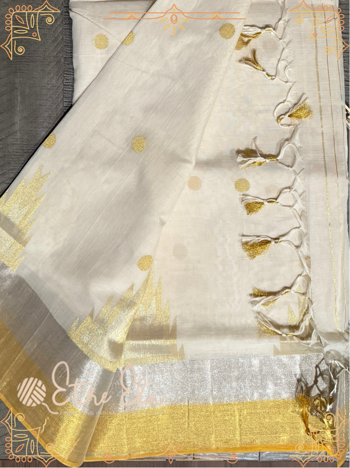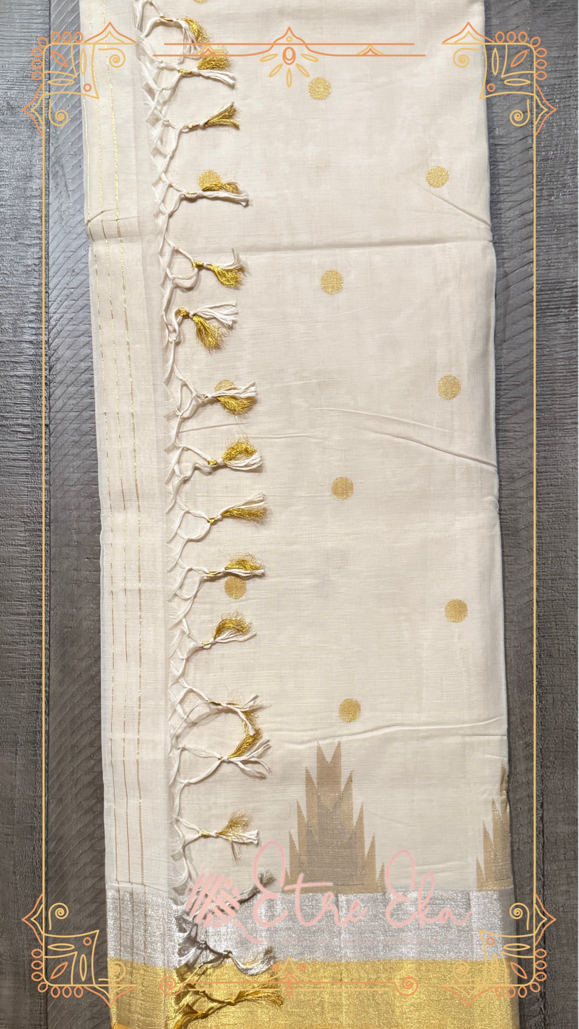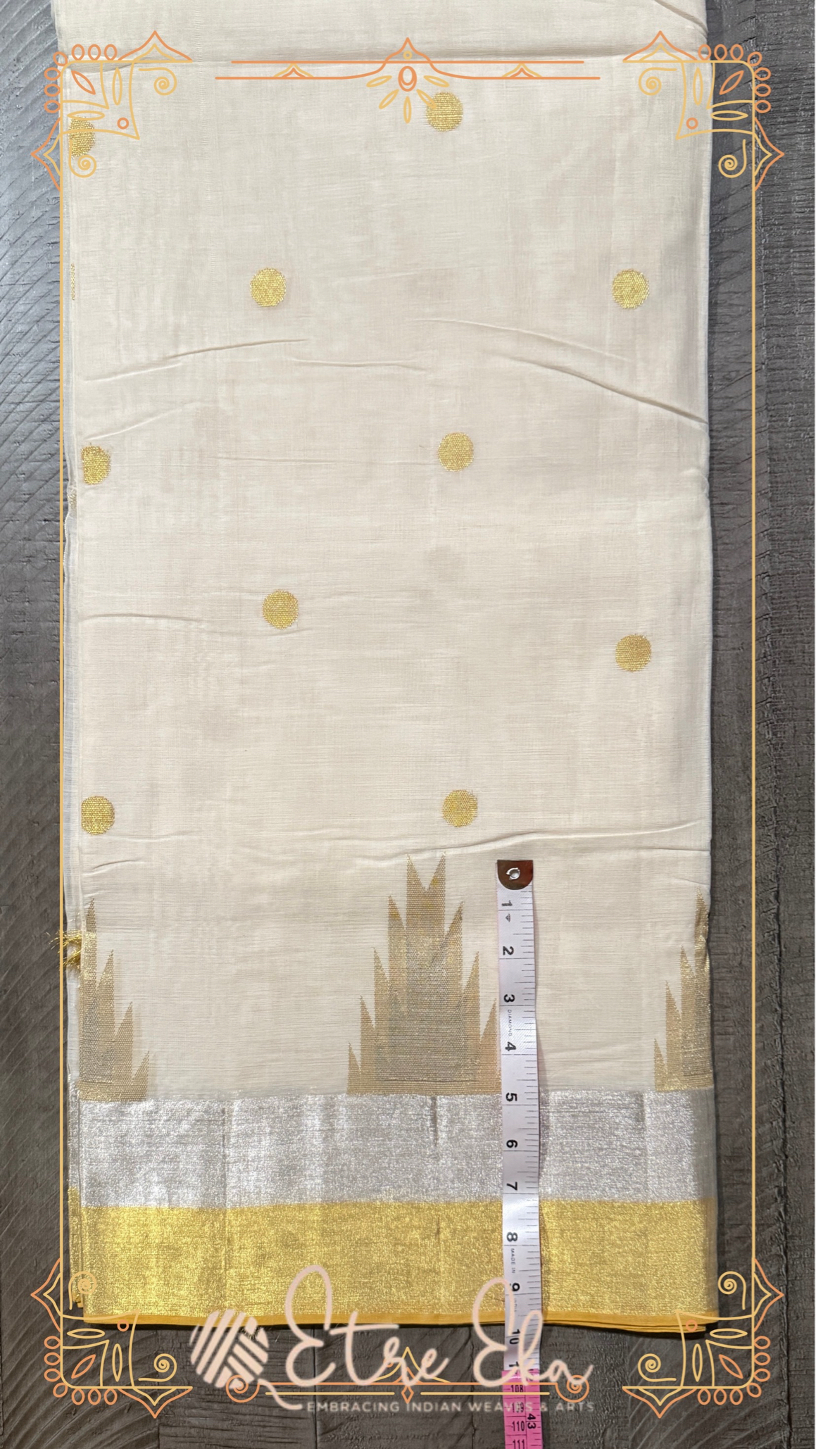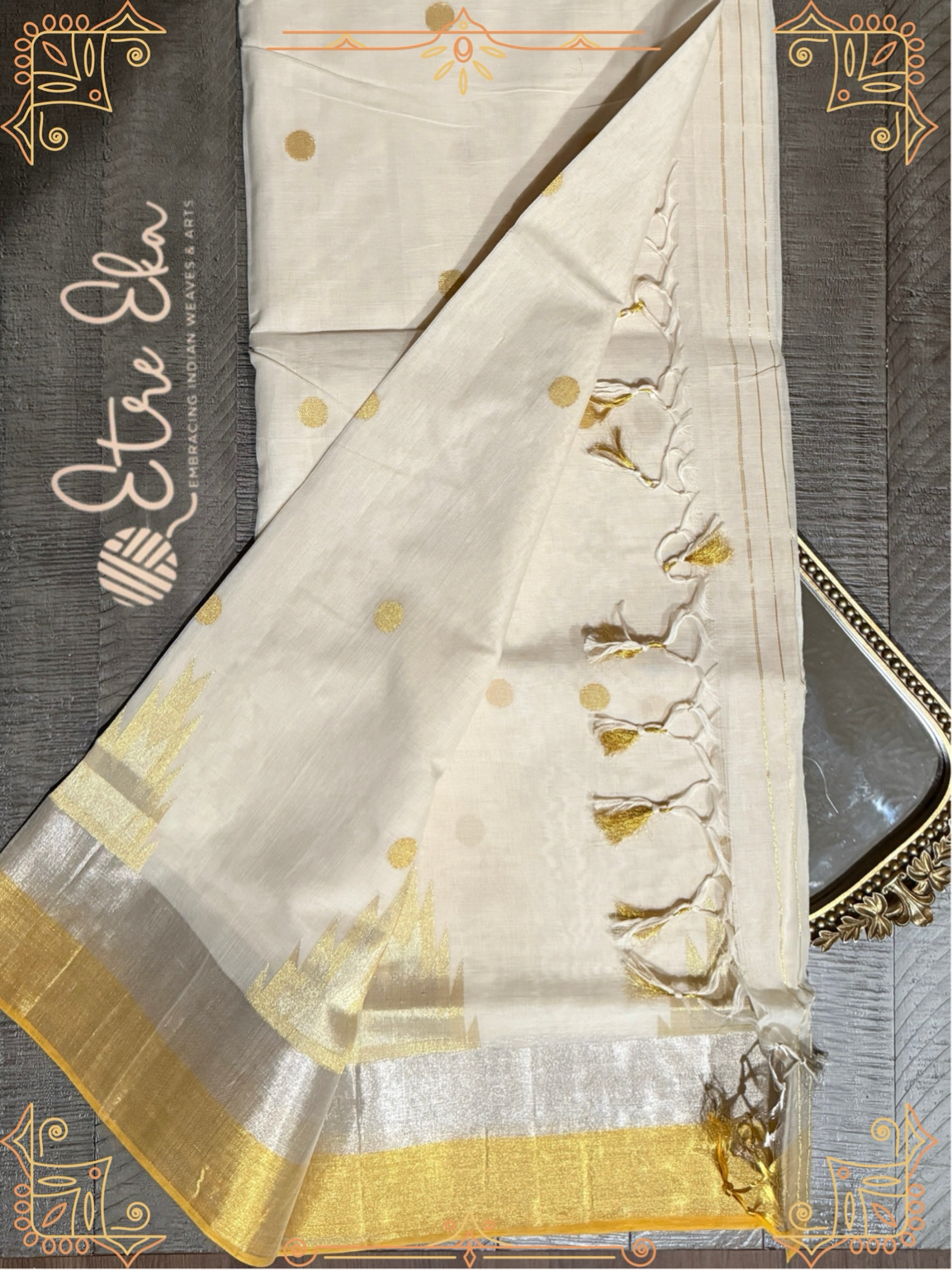 Kerala Saree from Balaramapuram custom Temple design Border and Polka Dot body- Gold and Silver