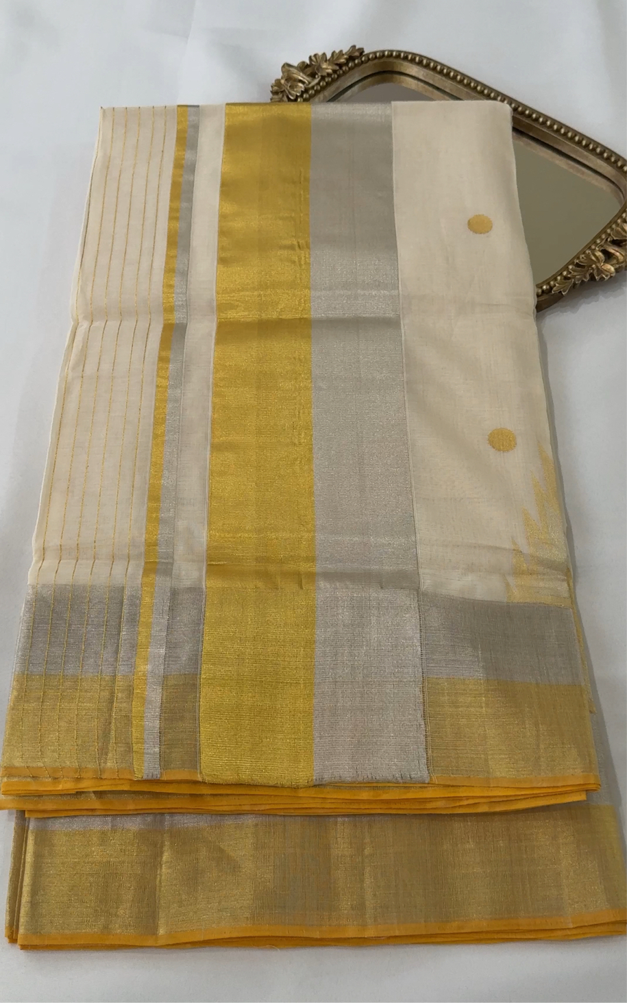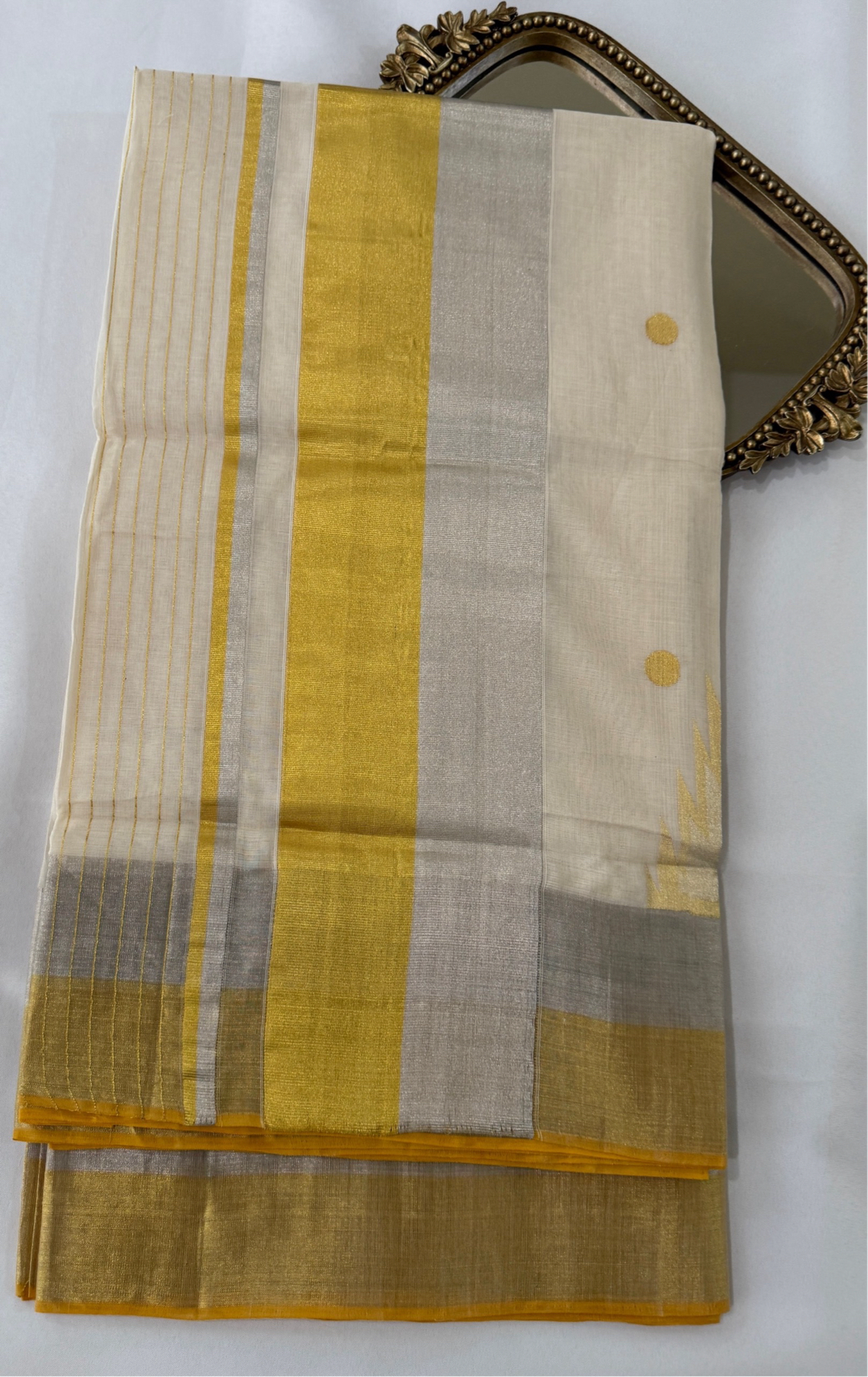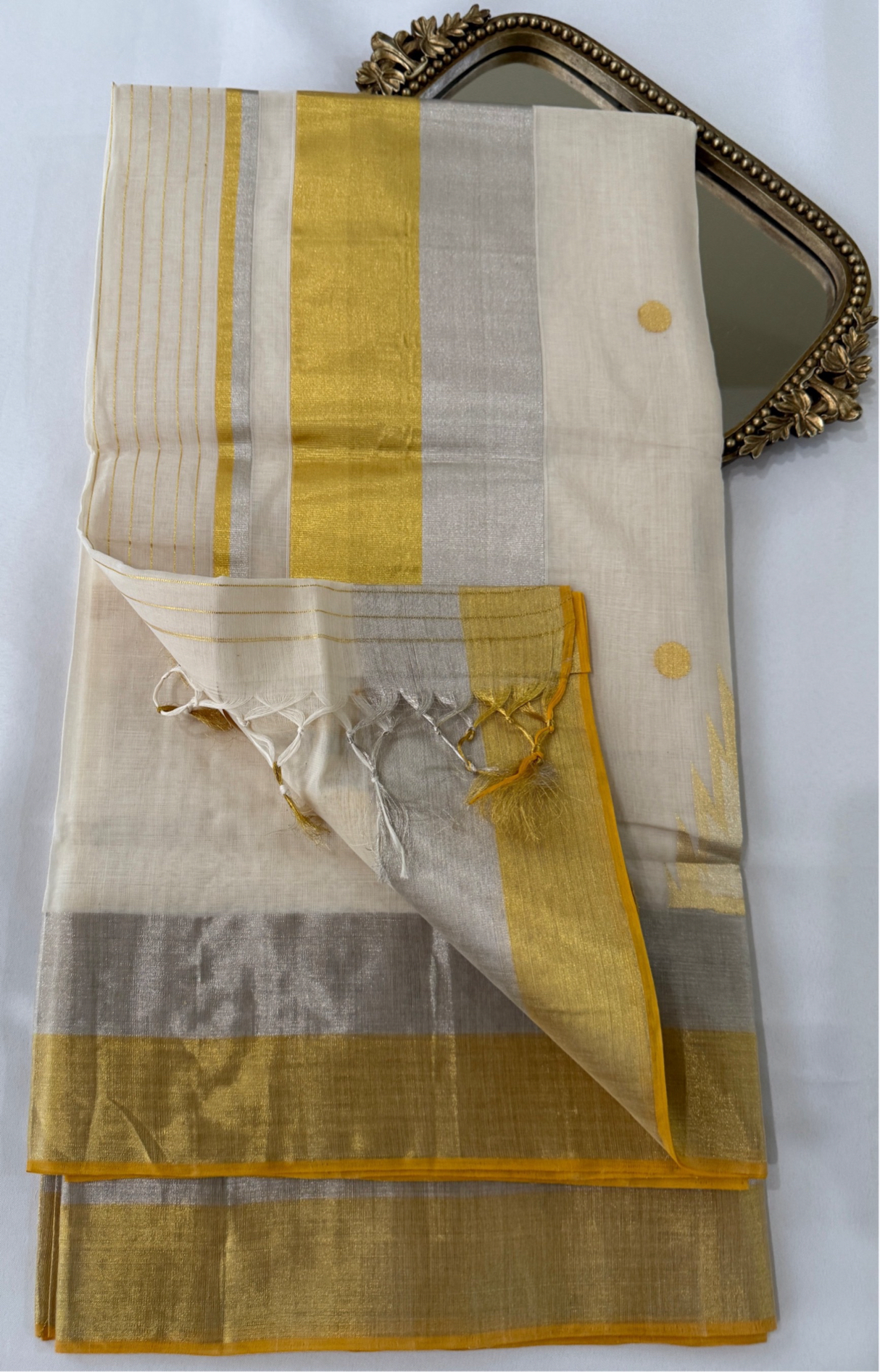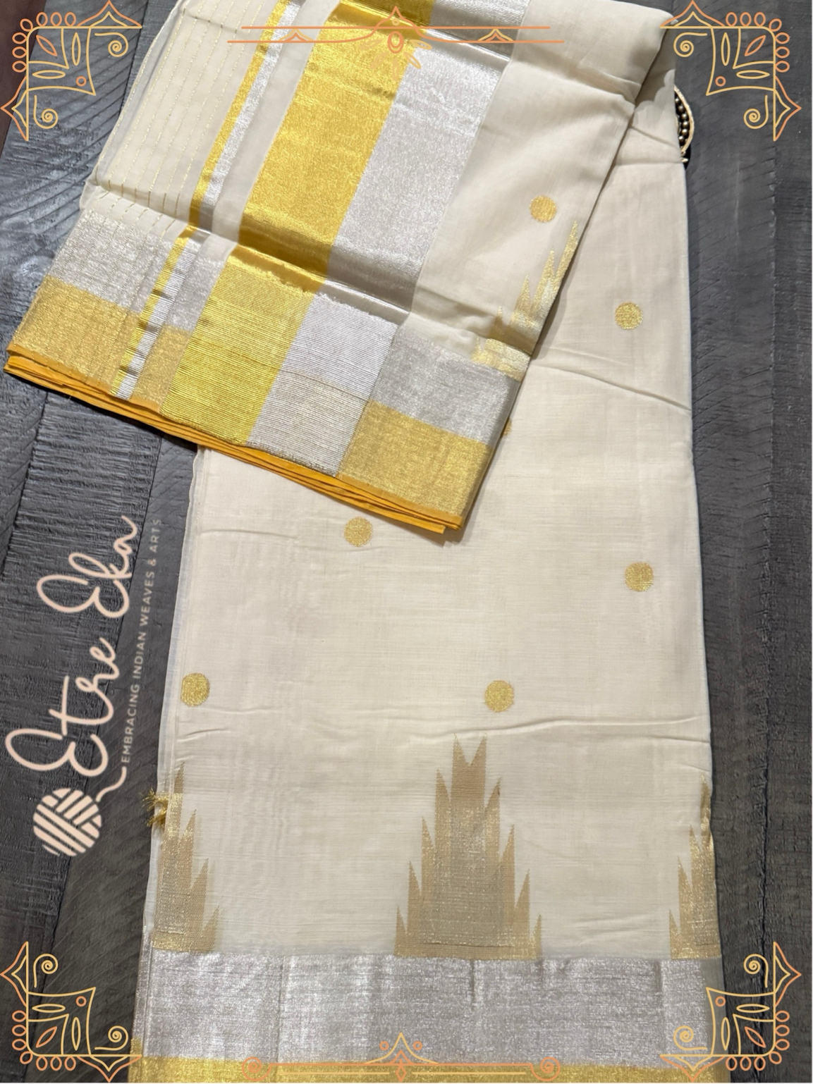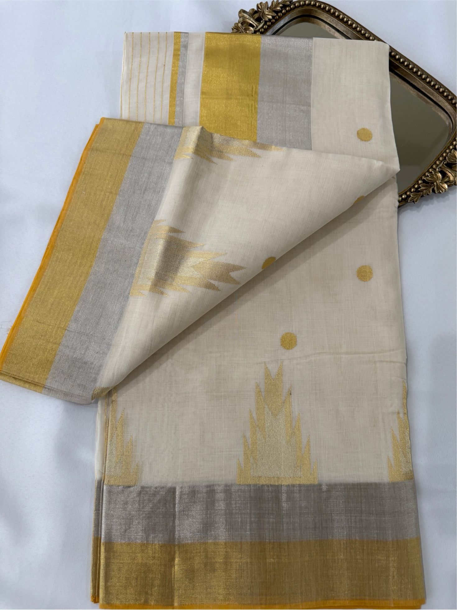Kerala Saree from Balaramapuram custom Temple design Border and Polka Dot body- Gold and Silver