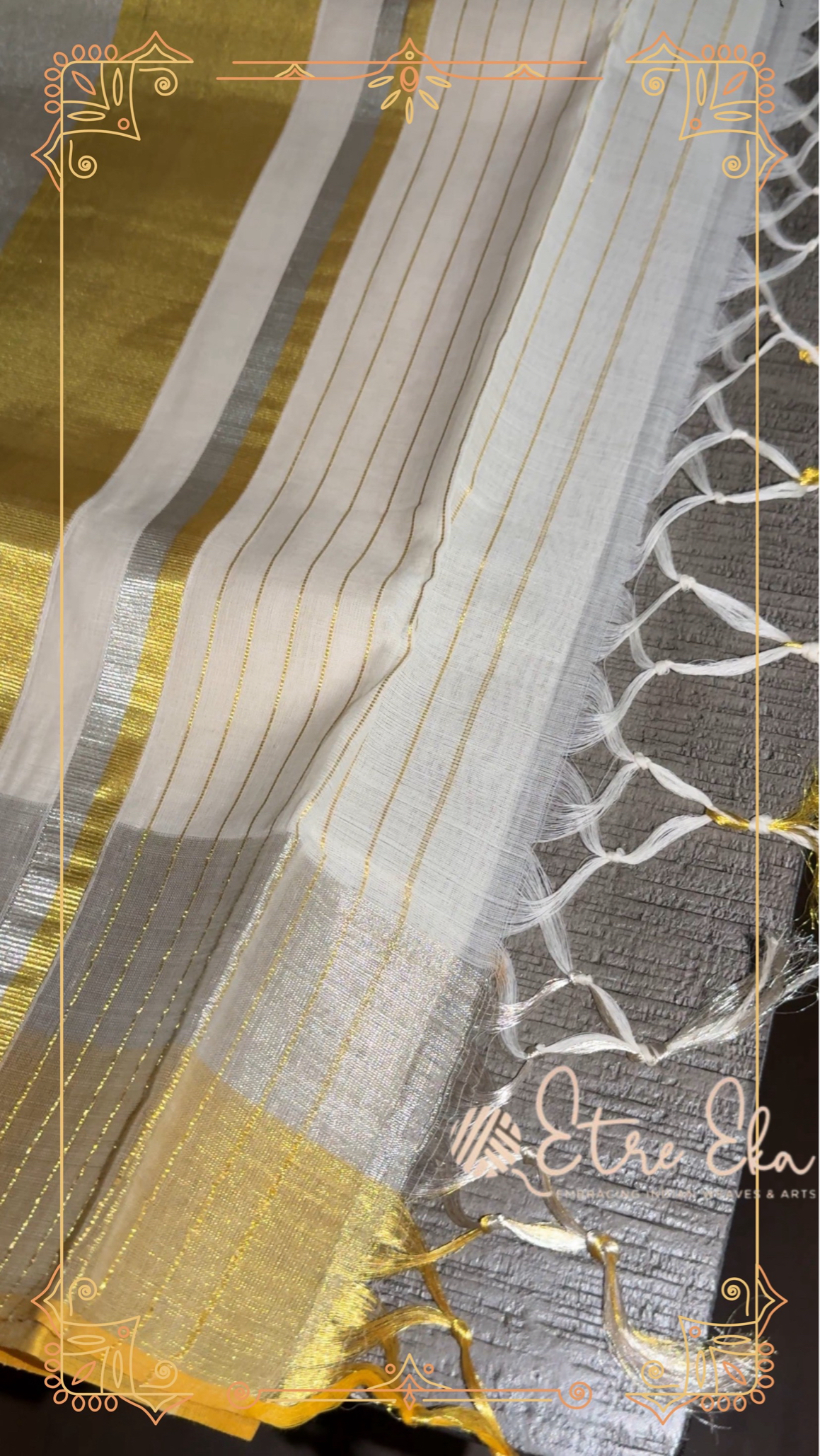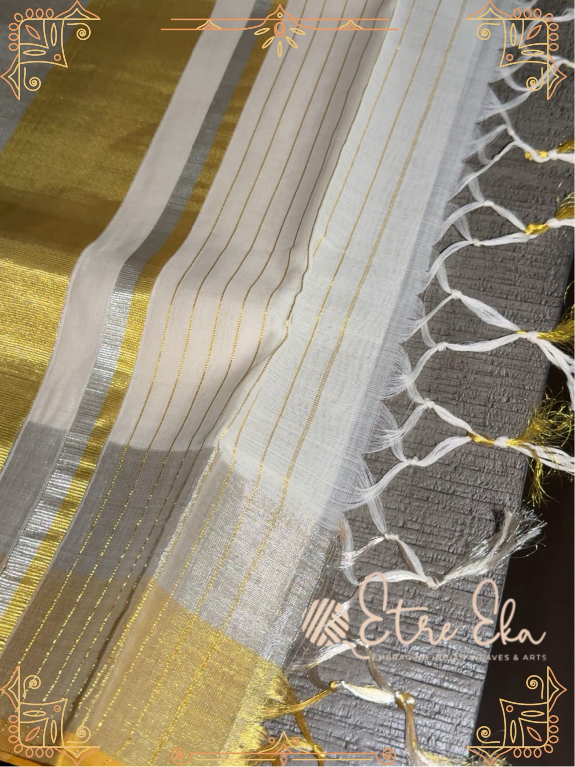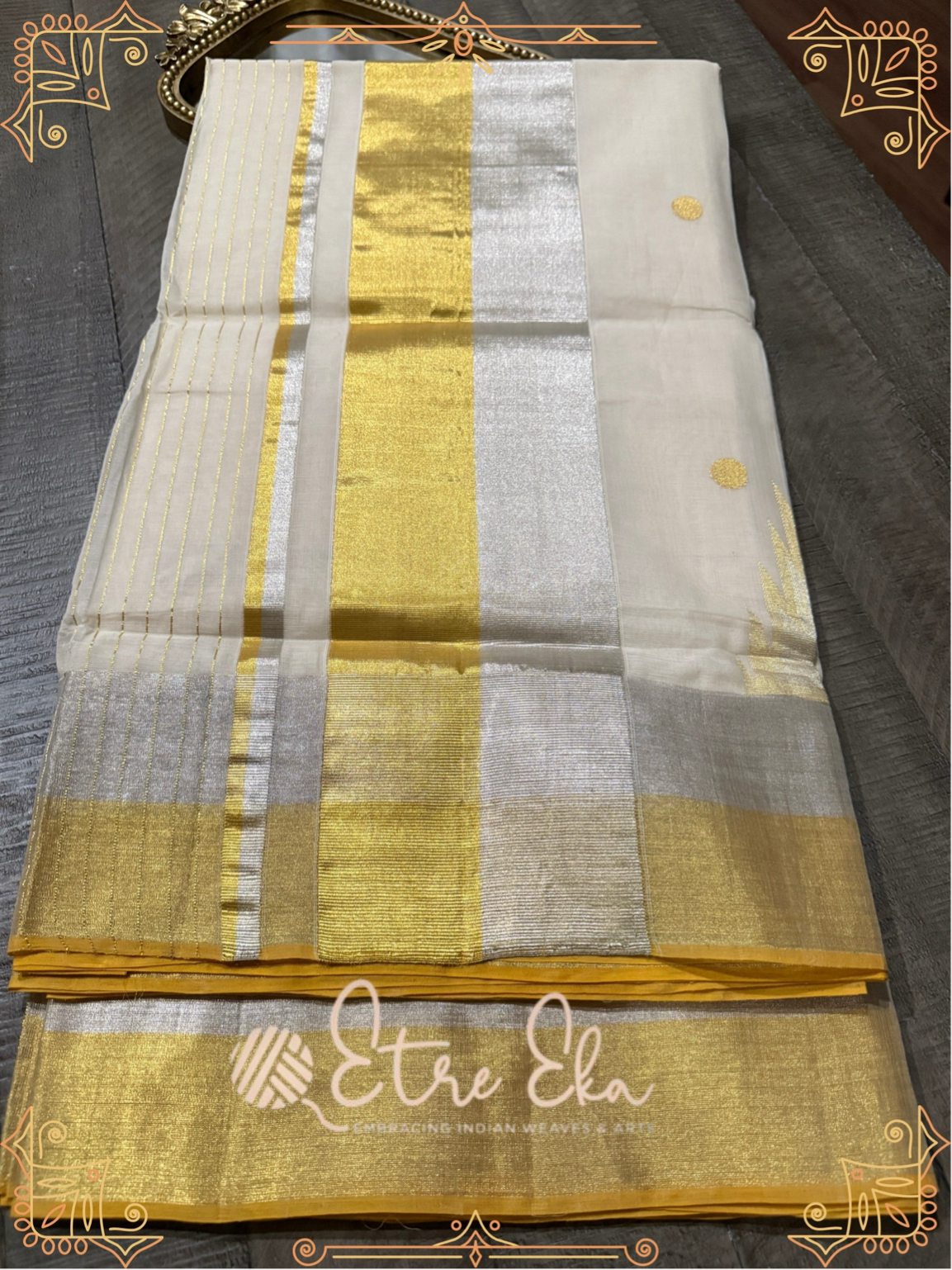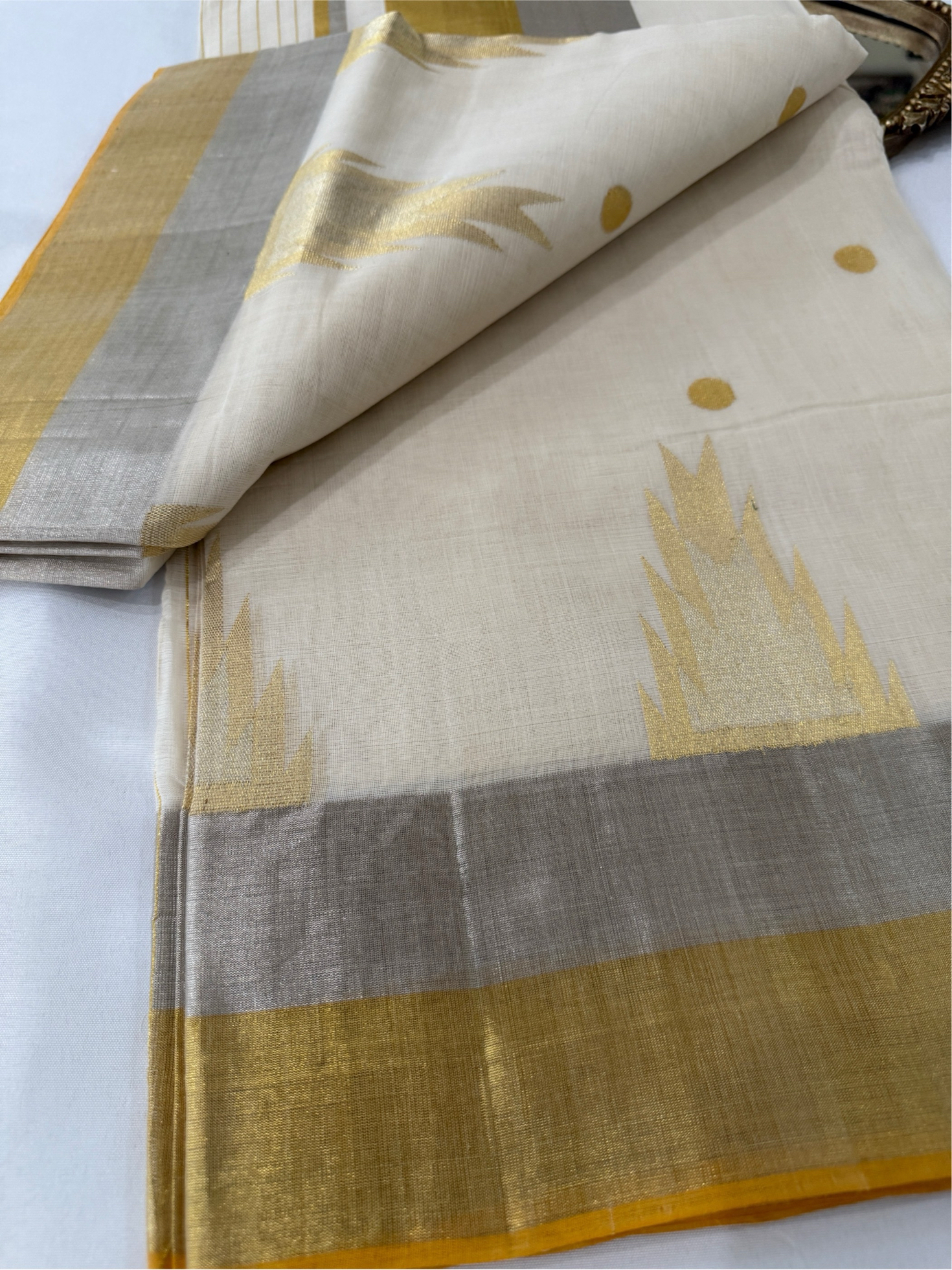 Kerala Saree from Balaramapuram custom Temple design Border and Polka Dot body- Gold and Silver