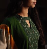 Double IKKAT Handloom Cotton Salwar Set/Yellow ,Green,White/Slitted & High Neck Top -Pencil Pant-IKKAT Dupatta