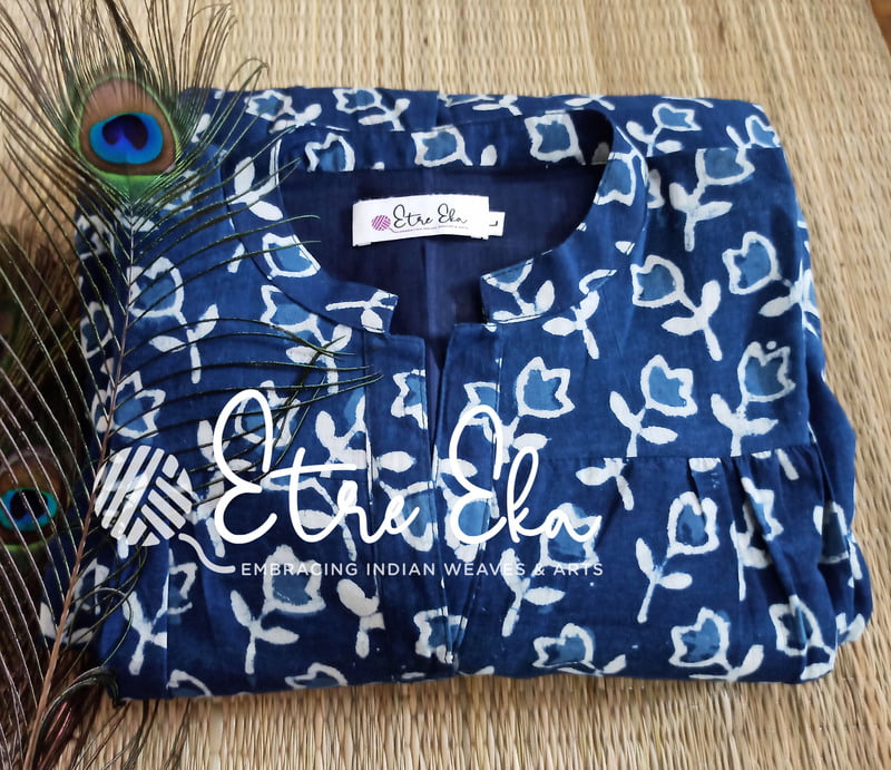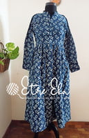 Indigo Print Long Dress with Long Sleeves and Chinese Collar