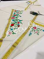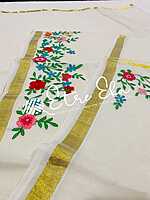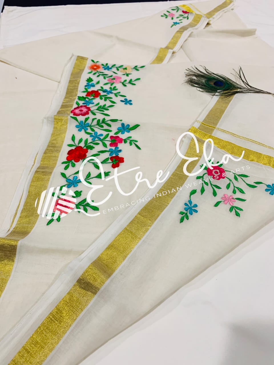 Kerala Saree from Kuthampully- Embroidered Hanging Garden with 1 inch Plain Gold JARI