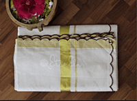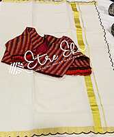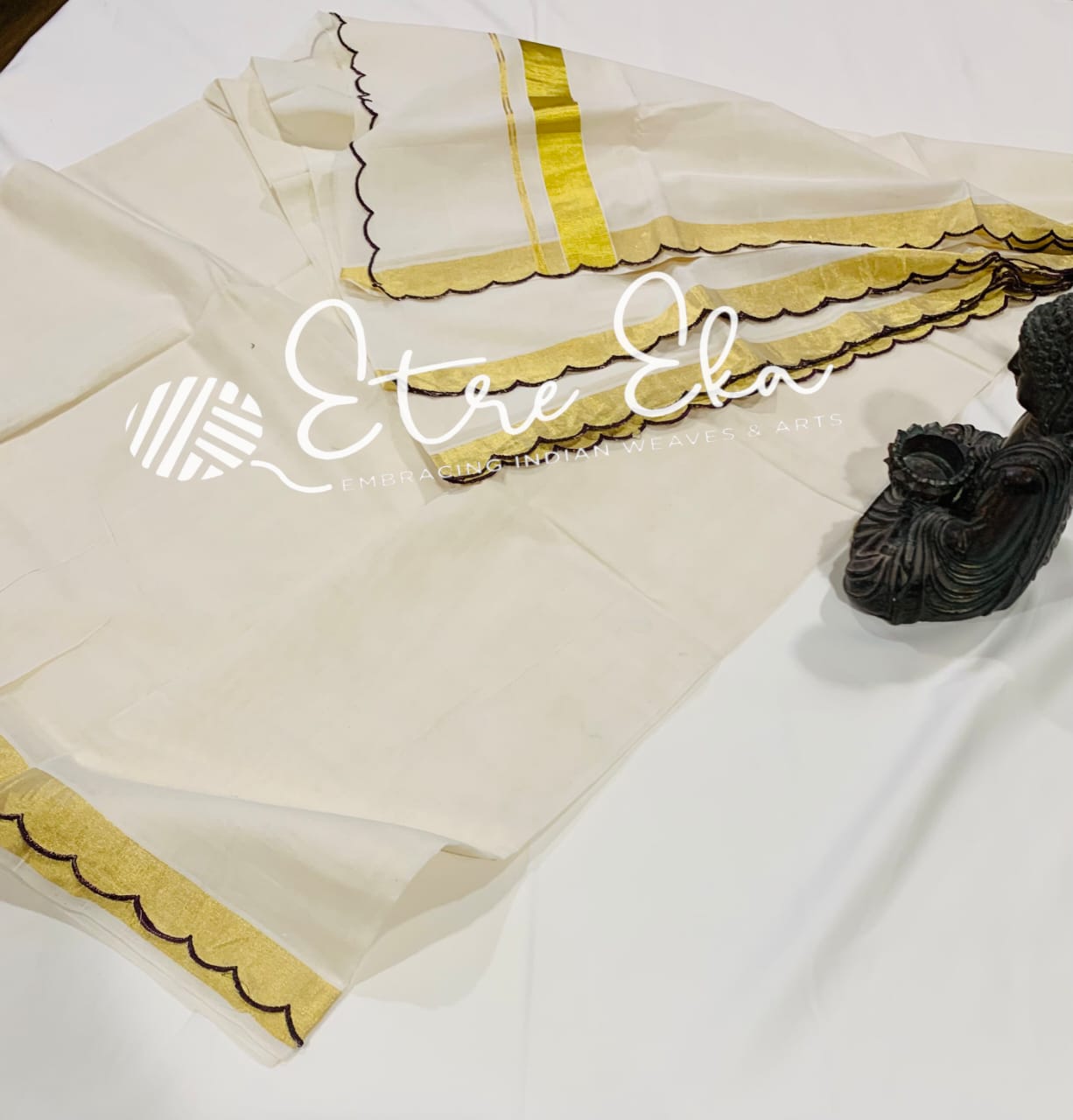 Kerala Saree from Kuthampully 80X80 yarn. 1.5 inches Plain Gold JARI with Maroon or Green Scalloping