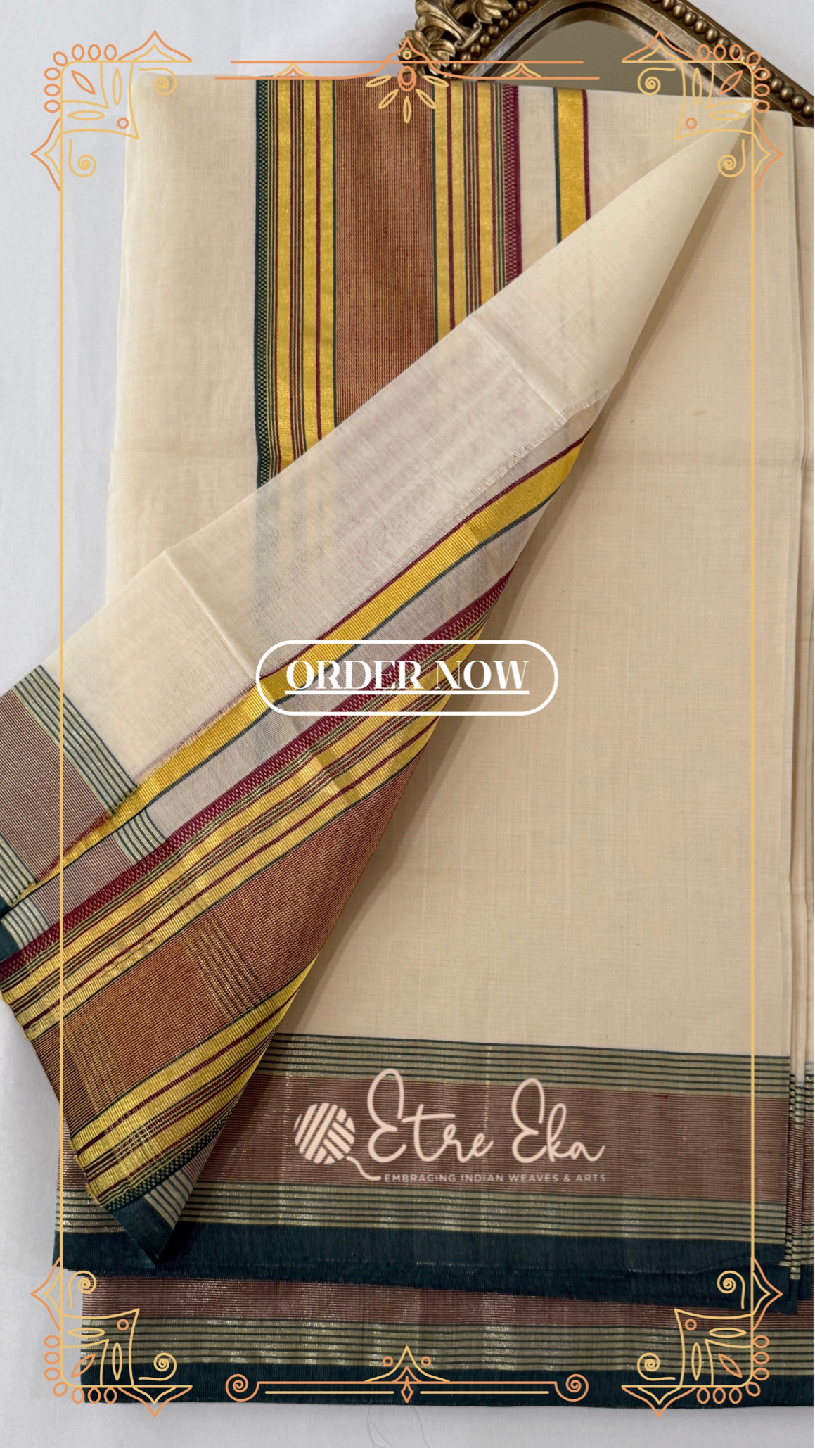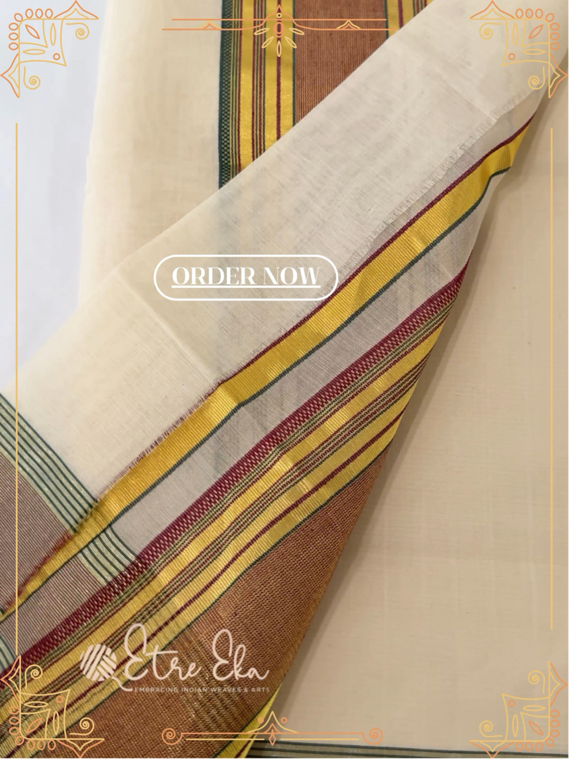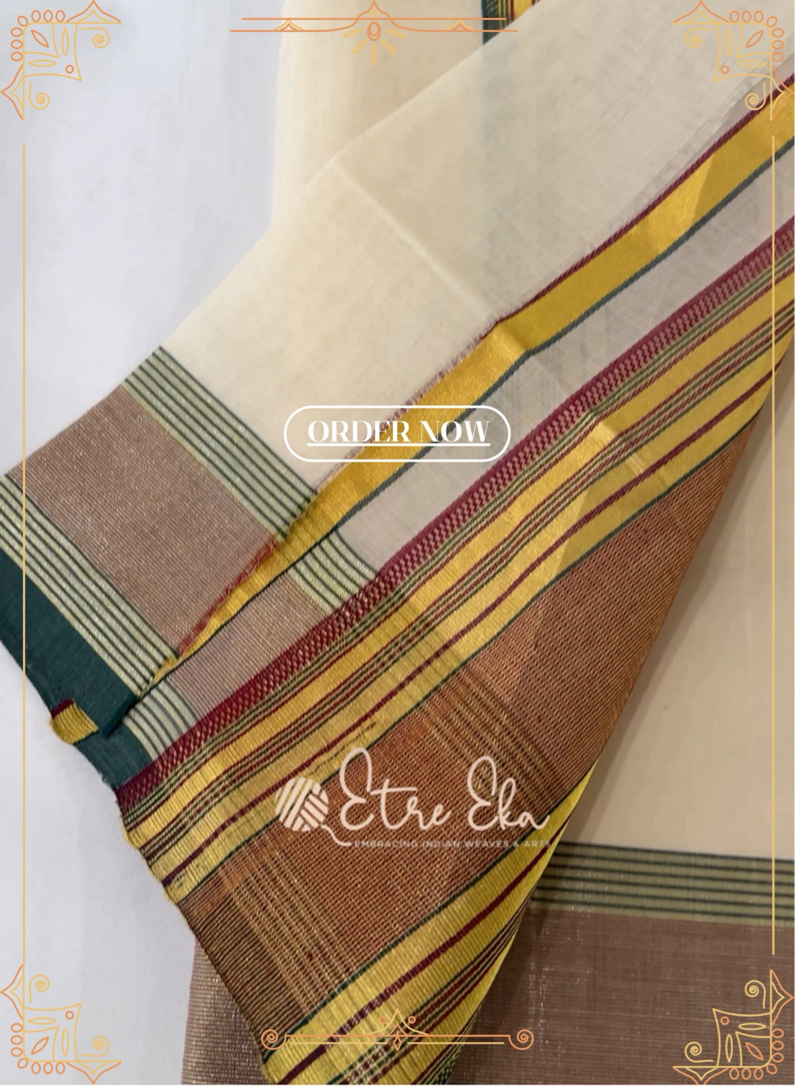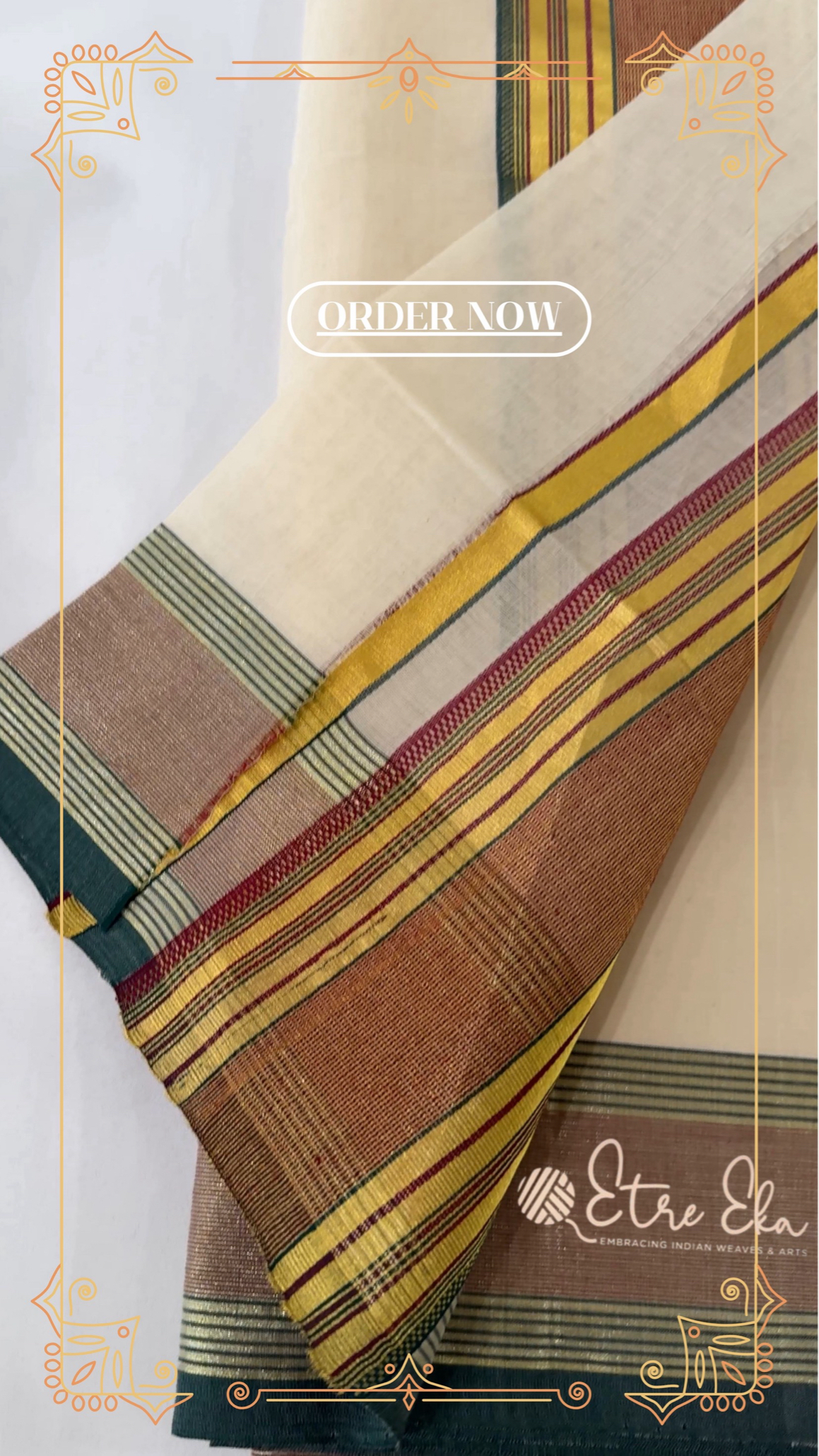 Kerala Saree from Balaramapuram With Maroon , Green and Gold