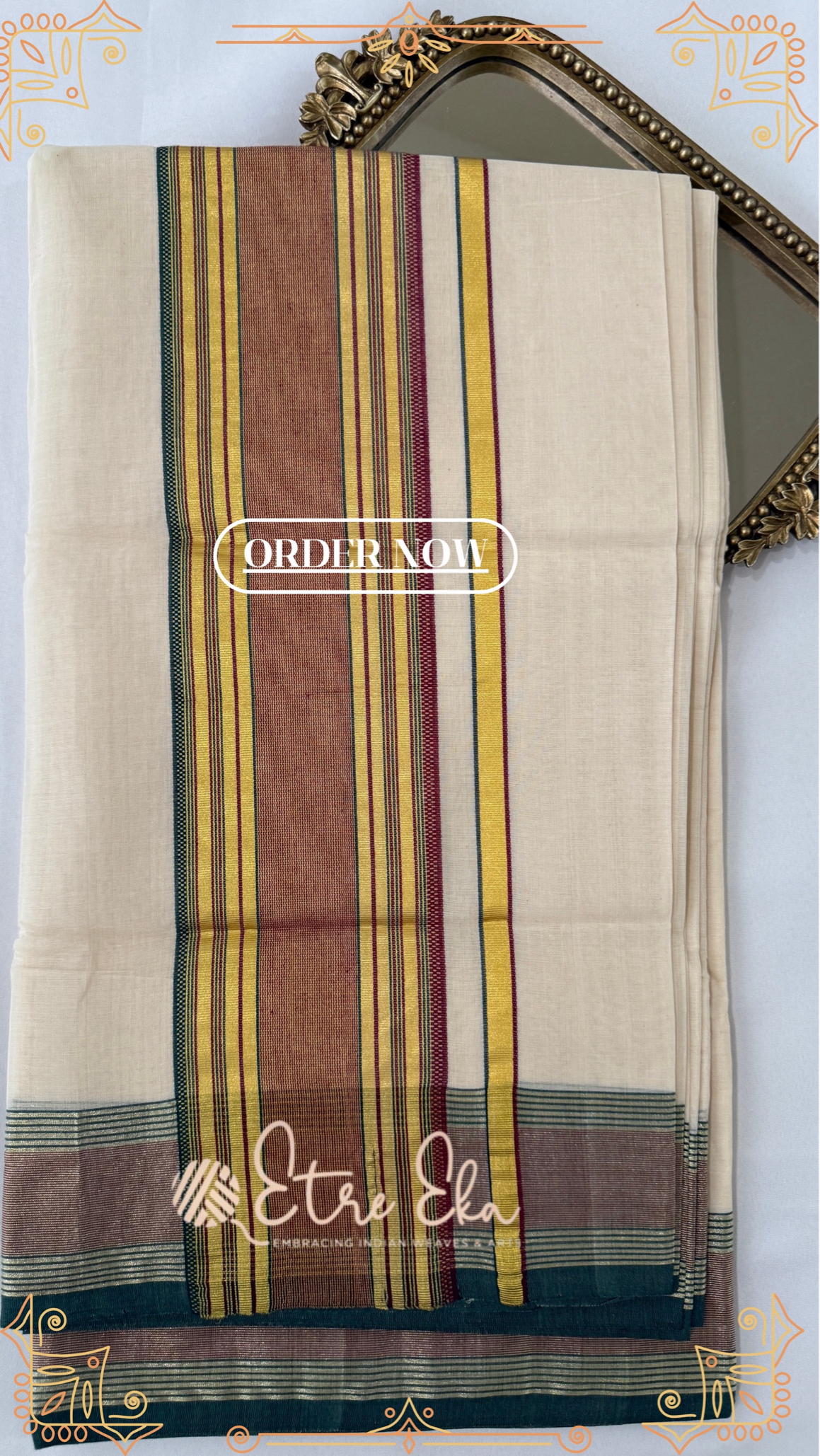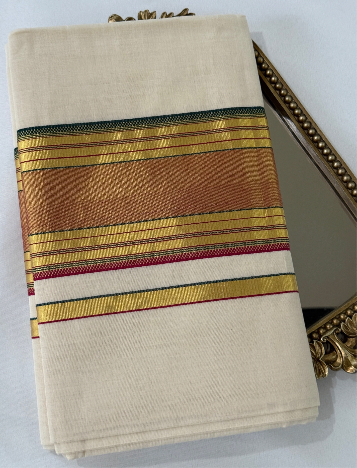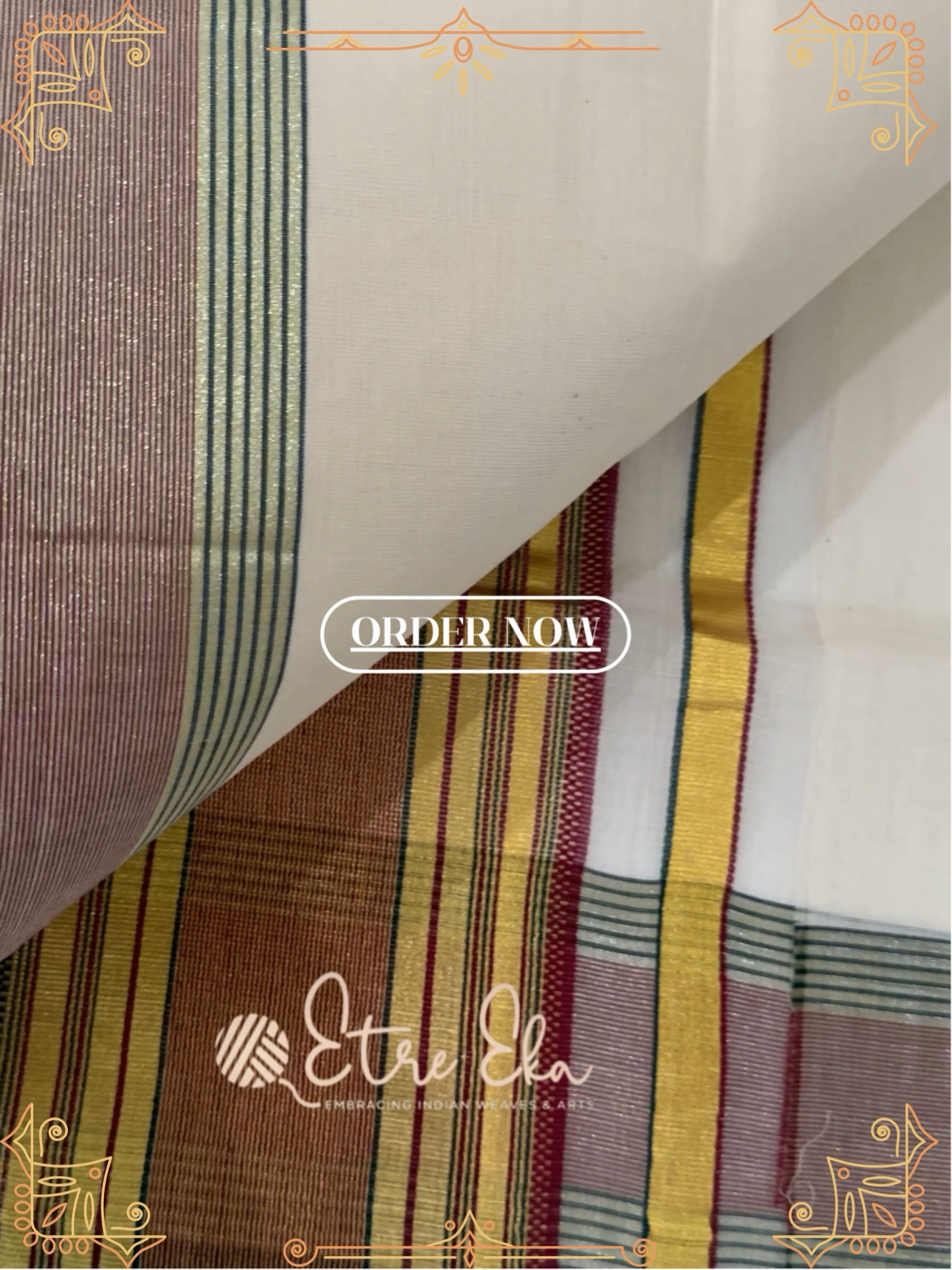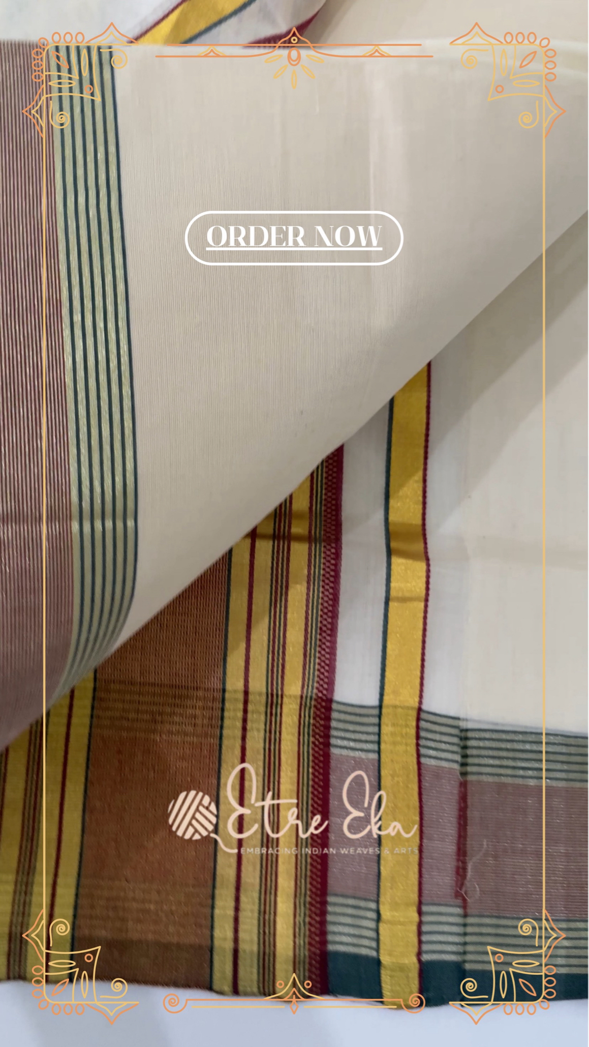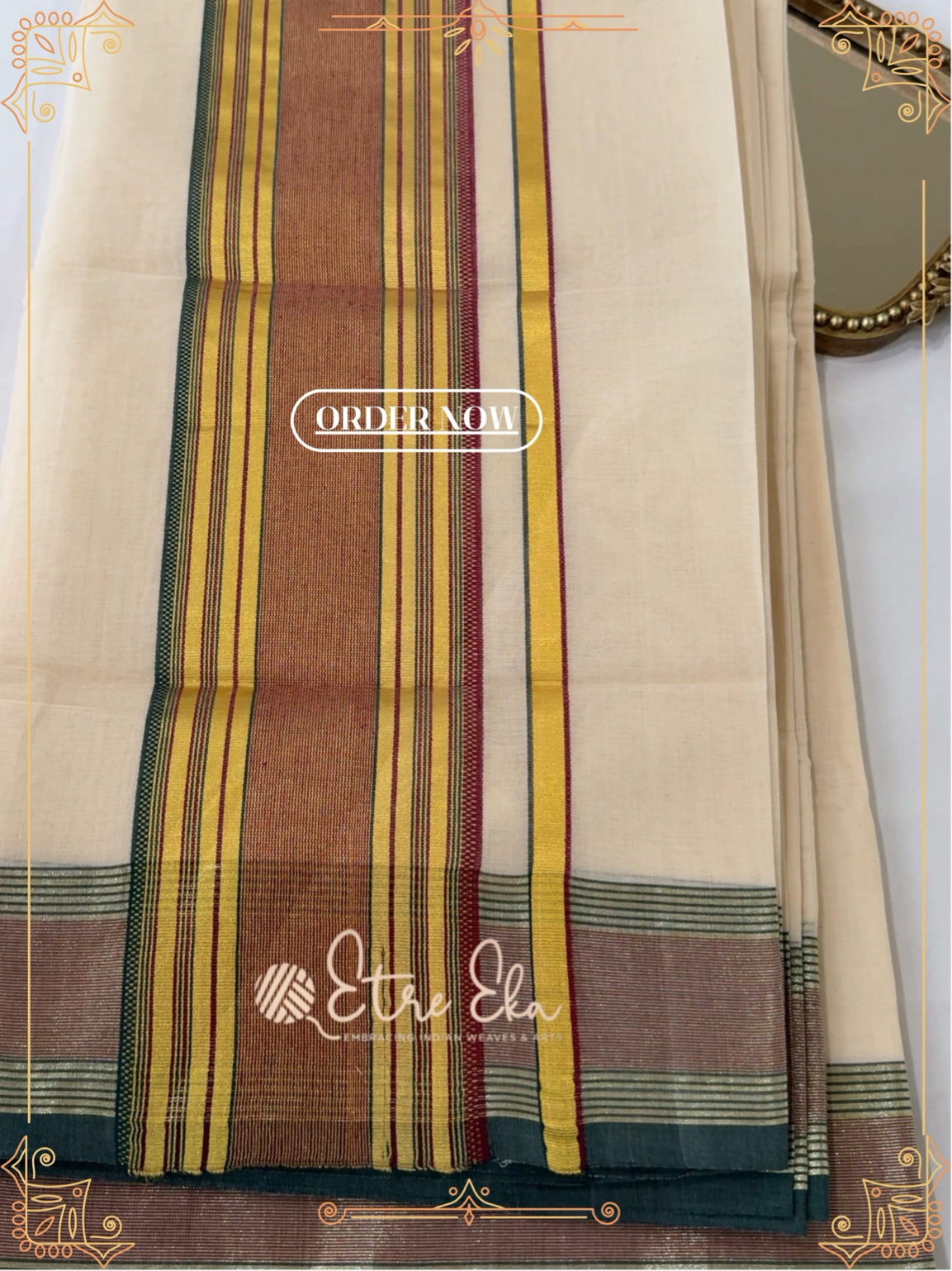 Kerala Saree from Balaramapuram With Maroon , Green and Gold