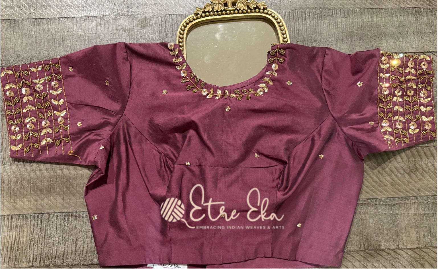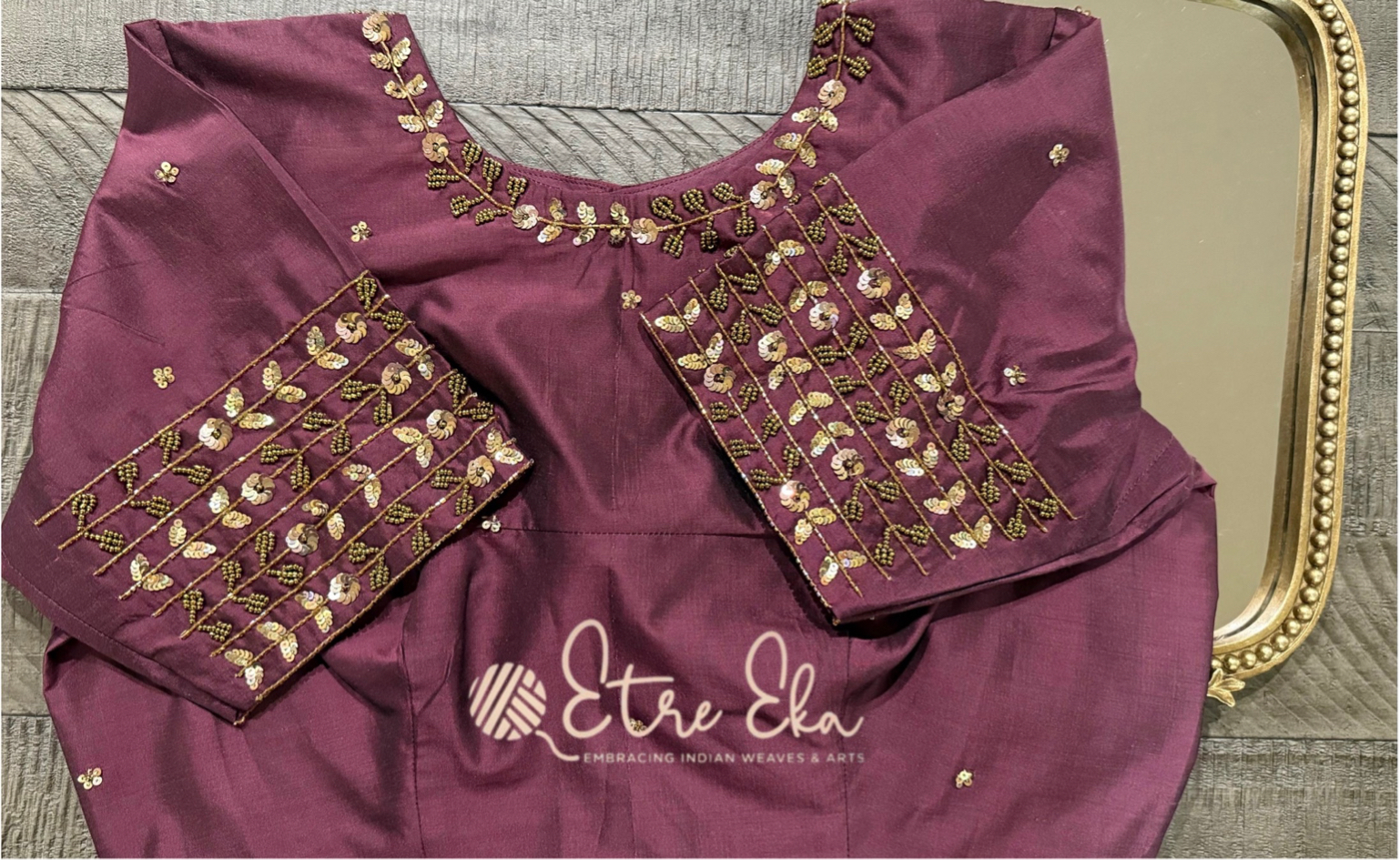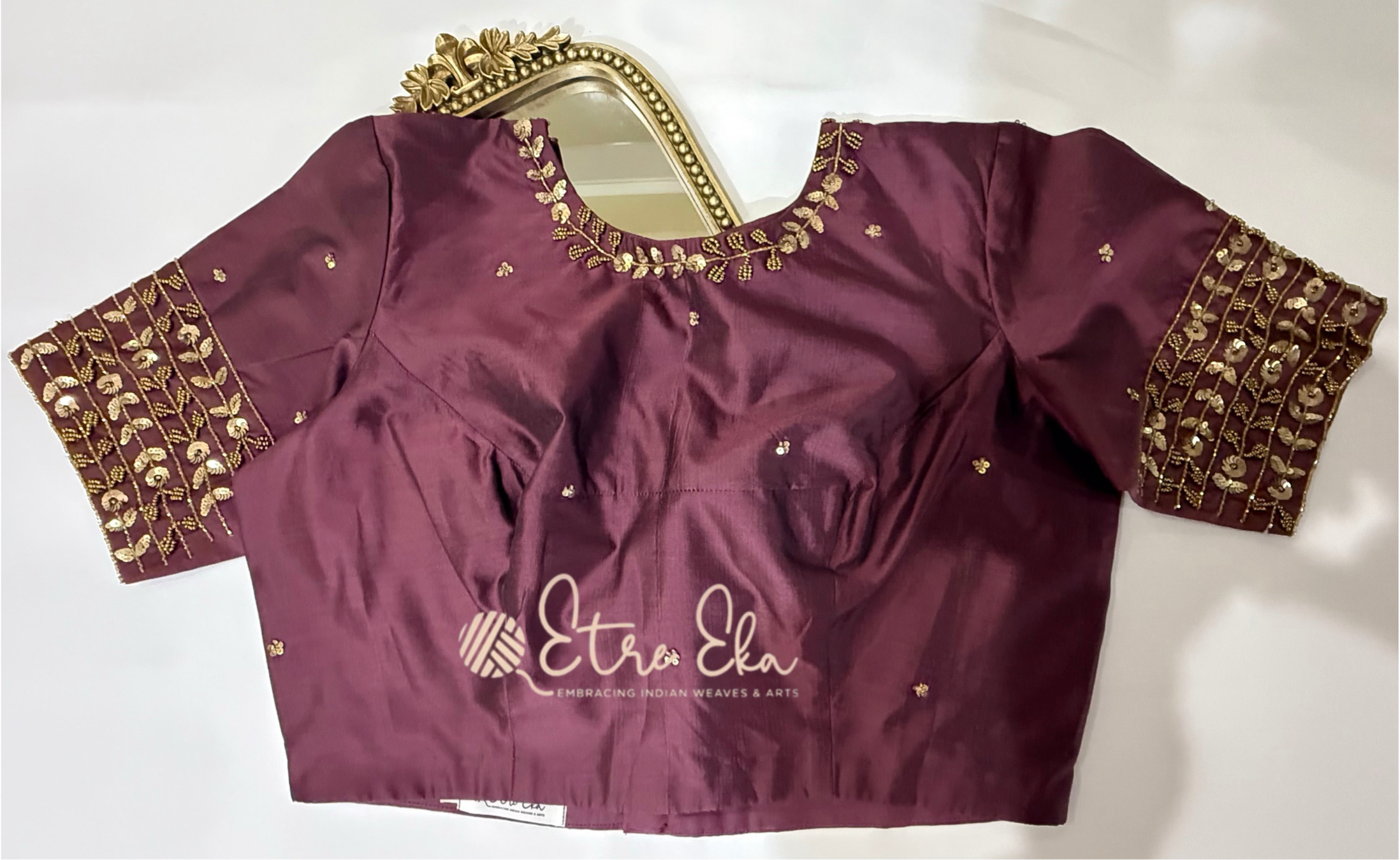 Beautiful Designer Pure Silk Purple Saree Blouse with Flower string Handwork on Neck , Sleeves- Front Open - XL