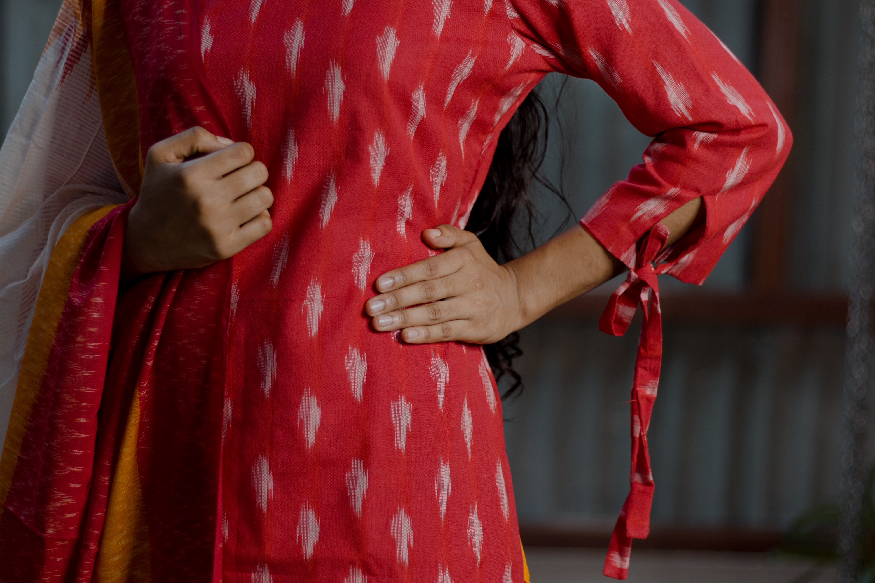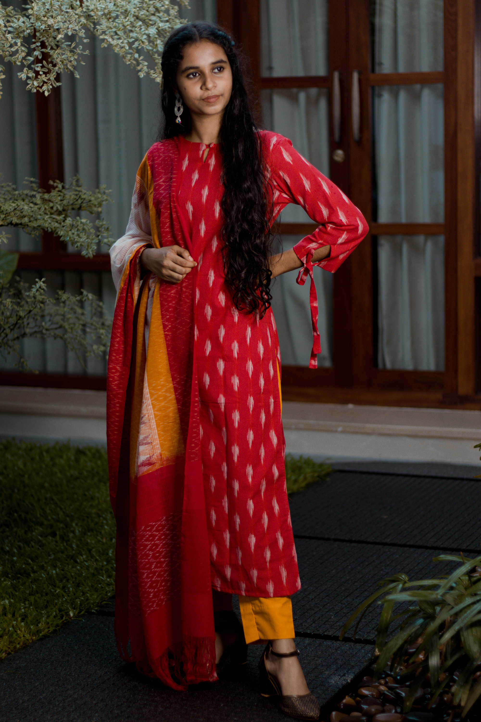Double IKKAT Handloom Cotton Salwar Set/Yellow-Red-White/Slitted & Tie on Sleeves Top -Pencil Pant-IKKAT Dupatta