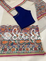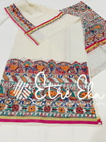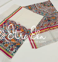 Kerala Set Saree from Kuthumpully 80x80 yarn. Pink and Gold Border -Madhubani Painted Peacock and Fish drawing on Mundu Set Mundu